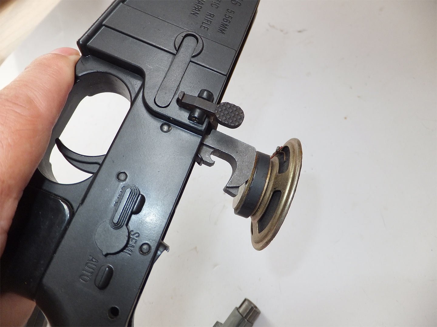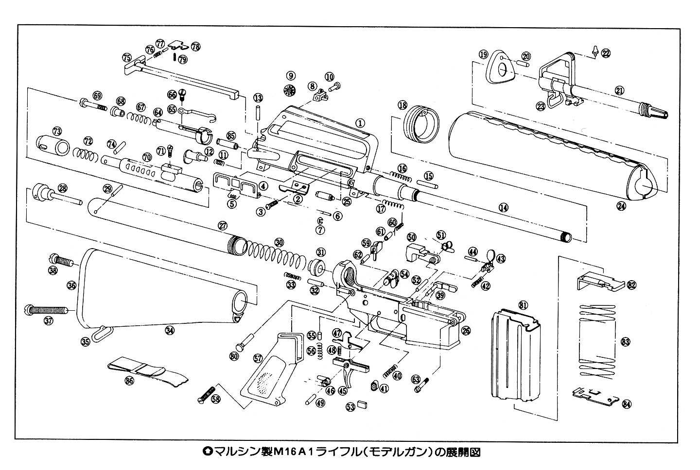 マルシンのM16・2型です。当初はエジェクターが実物のようにボルトに付いていてボルトフォワード機構もありませんでした。 空軍向けのM16 モデル604 というのが近いのではないかというモデルガンでした。