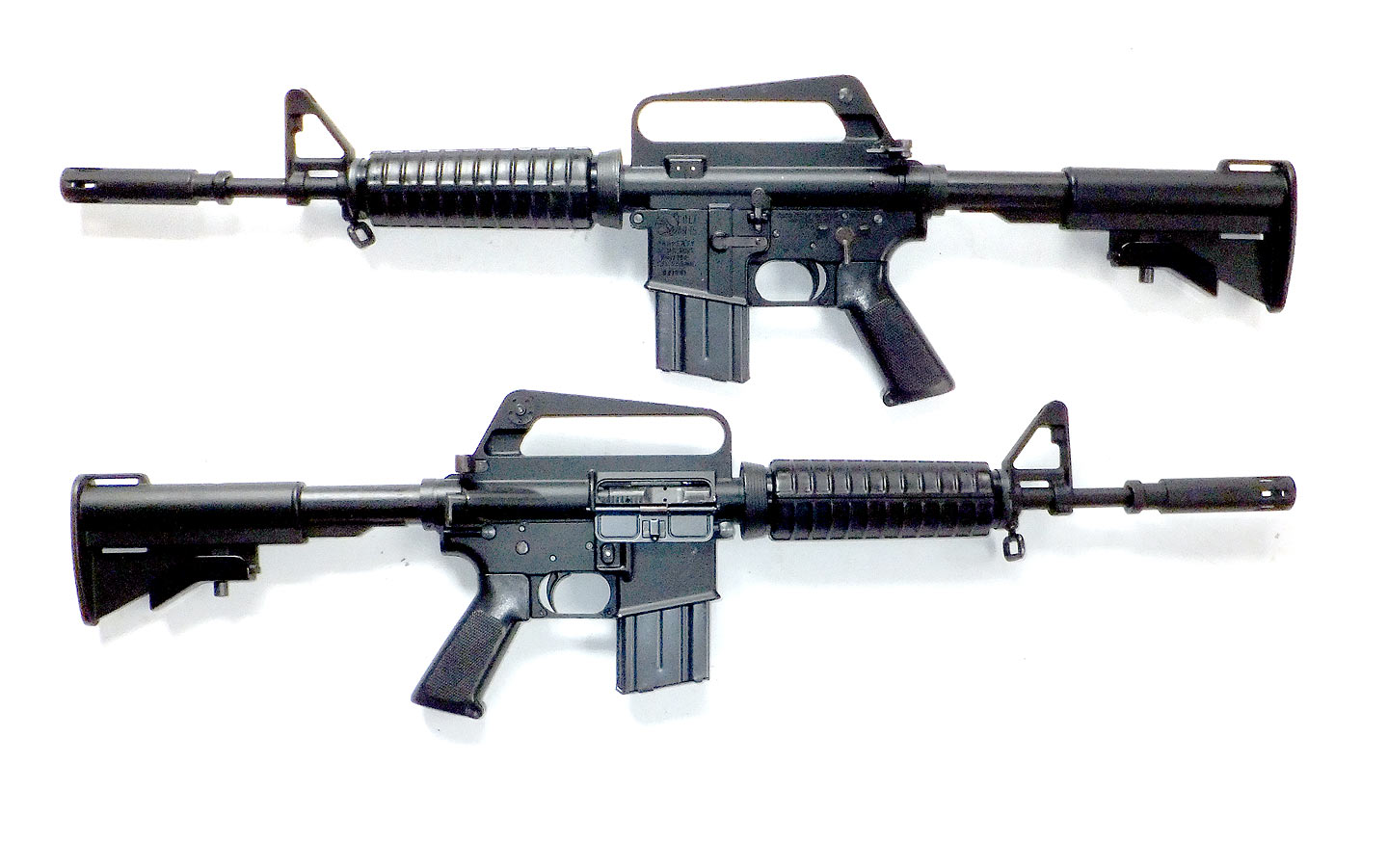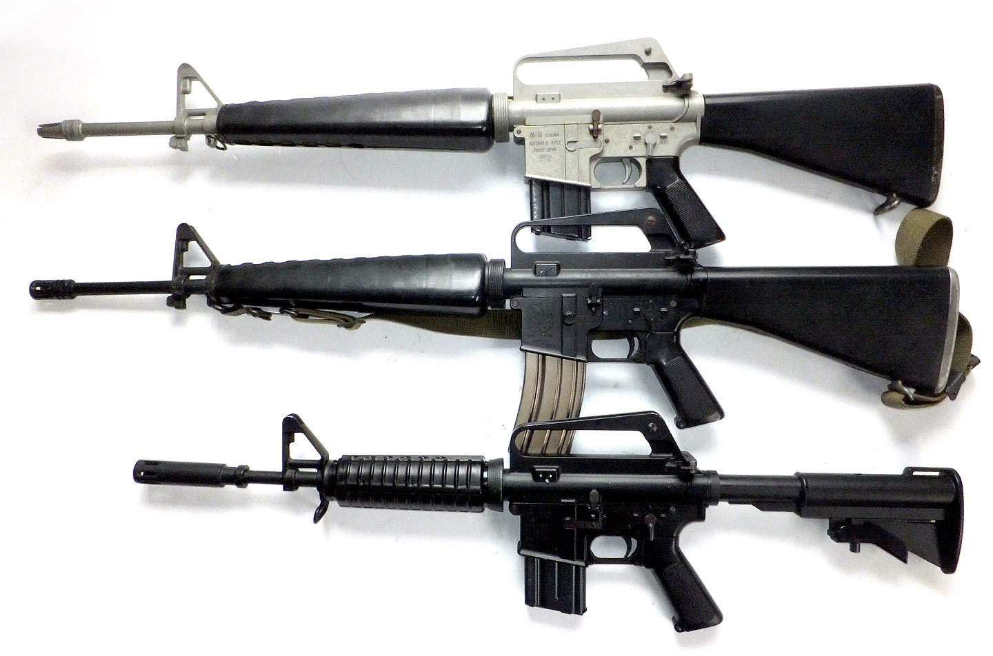 上からタニオコバ・M4、マルシンXM177、マルシン2型M16ですが、バレル長は 10.5インチ、14.5インチ、20インチとなっています(XM177E2は本当は11.5in+サプレッサ)。