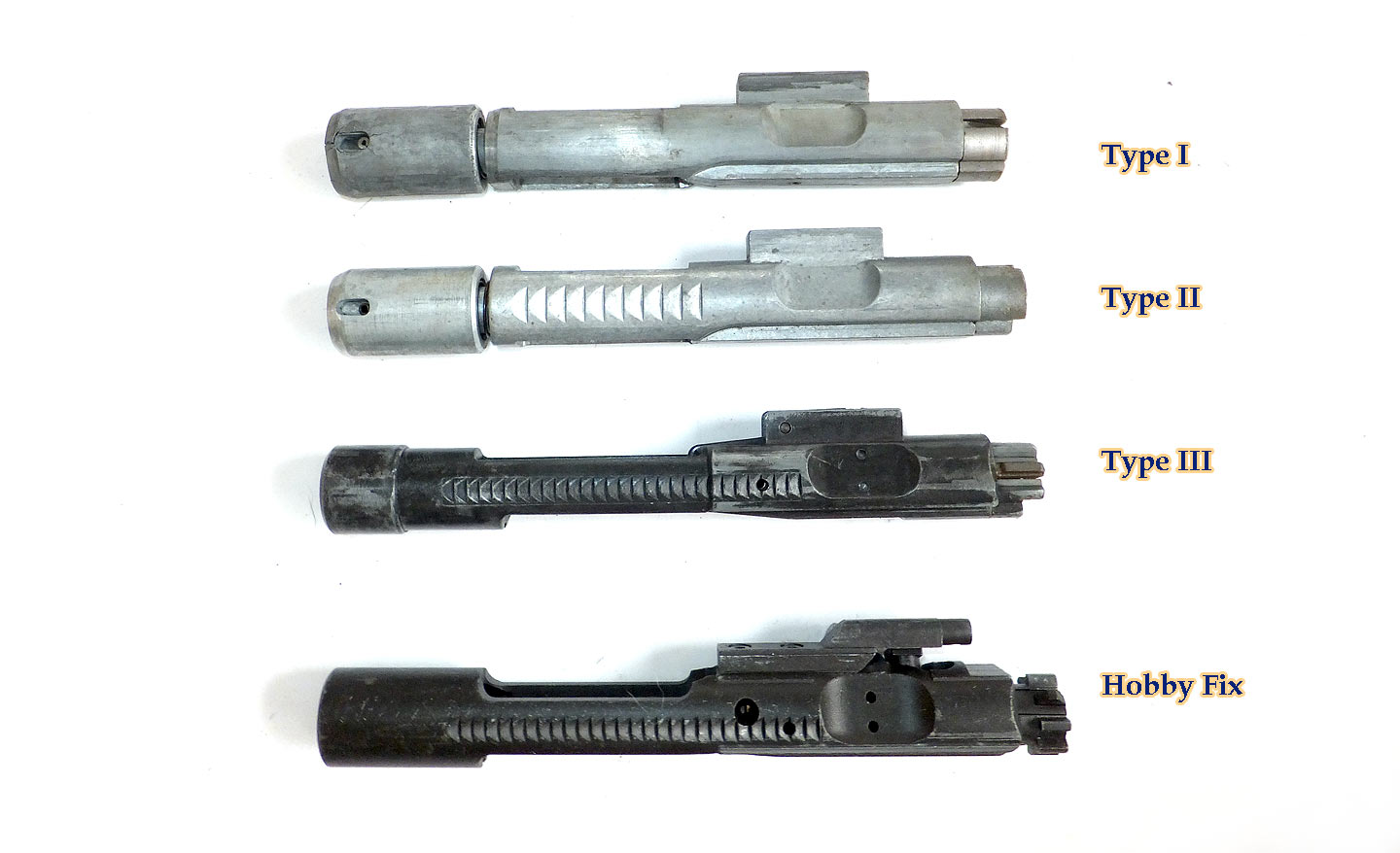 一番下のホビーフィックスは、参考に置いていますが本物そっくりなので別格なのですが、マルシンの3型ボルトは、かなり改善していて、いい線いっているなと思います。