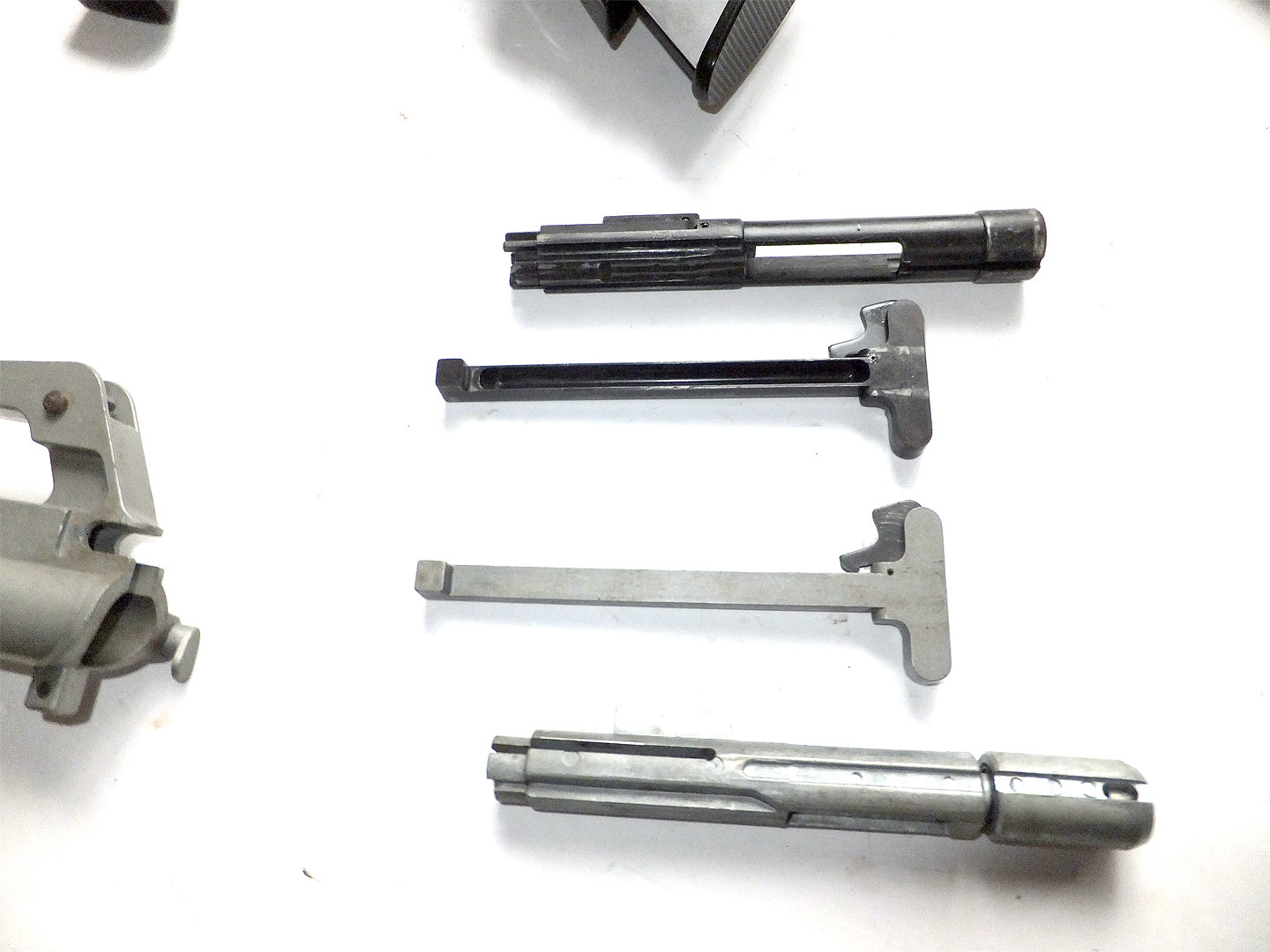 上が3型で実物のように肉抜きされたチャージングハンドルです。1,2型は、無垢ですので重いです。 また、本体の材料も3型では亜鉛ではなくアルミに変更されて、より実物のように軽くなっていますが、 本物は、3型のマルシン以上に軽いようです。