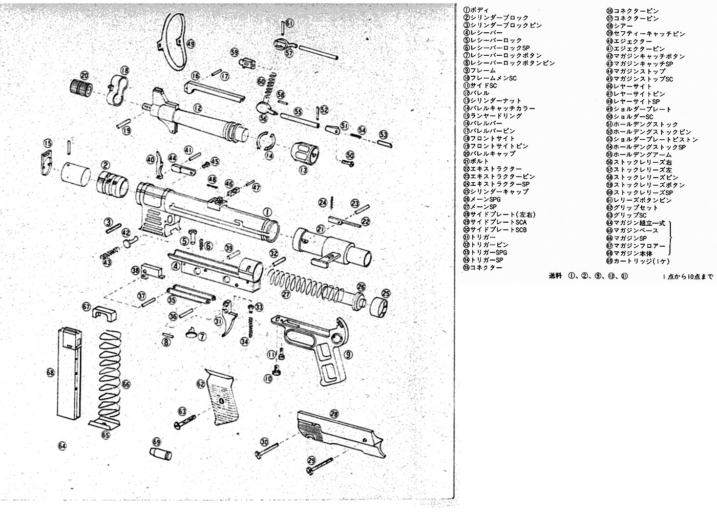 通常分解状態ですが、分解ボタンがキツキツでしたので、プラスチックのカバーも外してみました。 このカバーは、実銃では左右分割ではなくって一体物です。