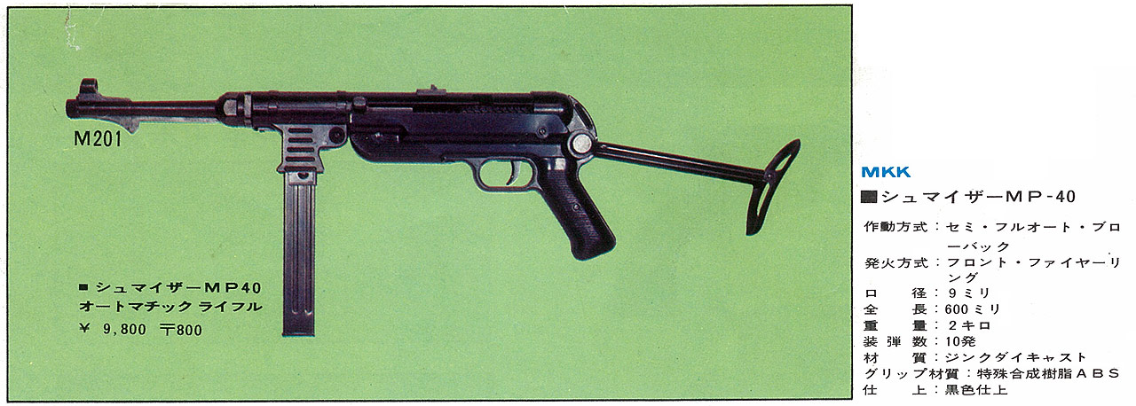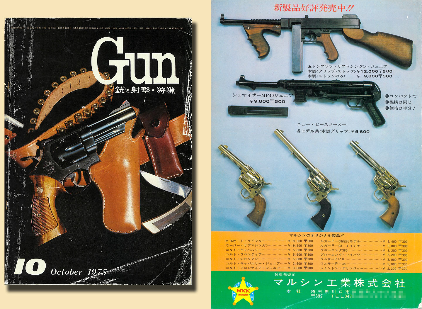 1975年10月号(昭和50年)のGun誌 広告にジュニア・トンプソンとMP40 が載っていました。 トンプソンの方は、ジュニアだとすぐに分かる形ですがMP40 は、それだけだったらよく分かりません。