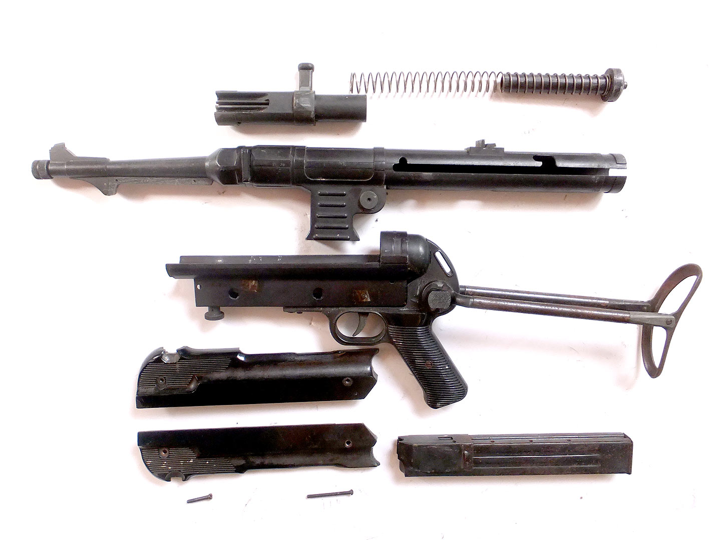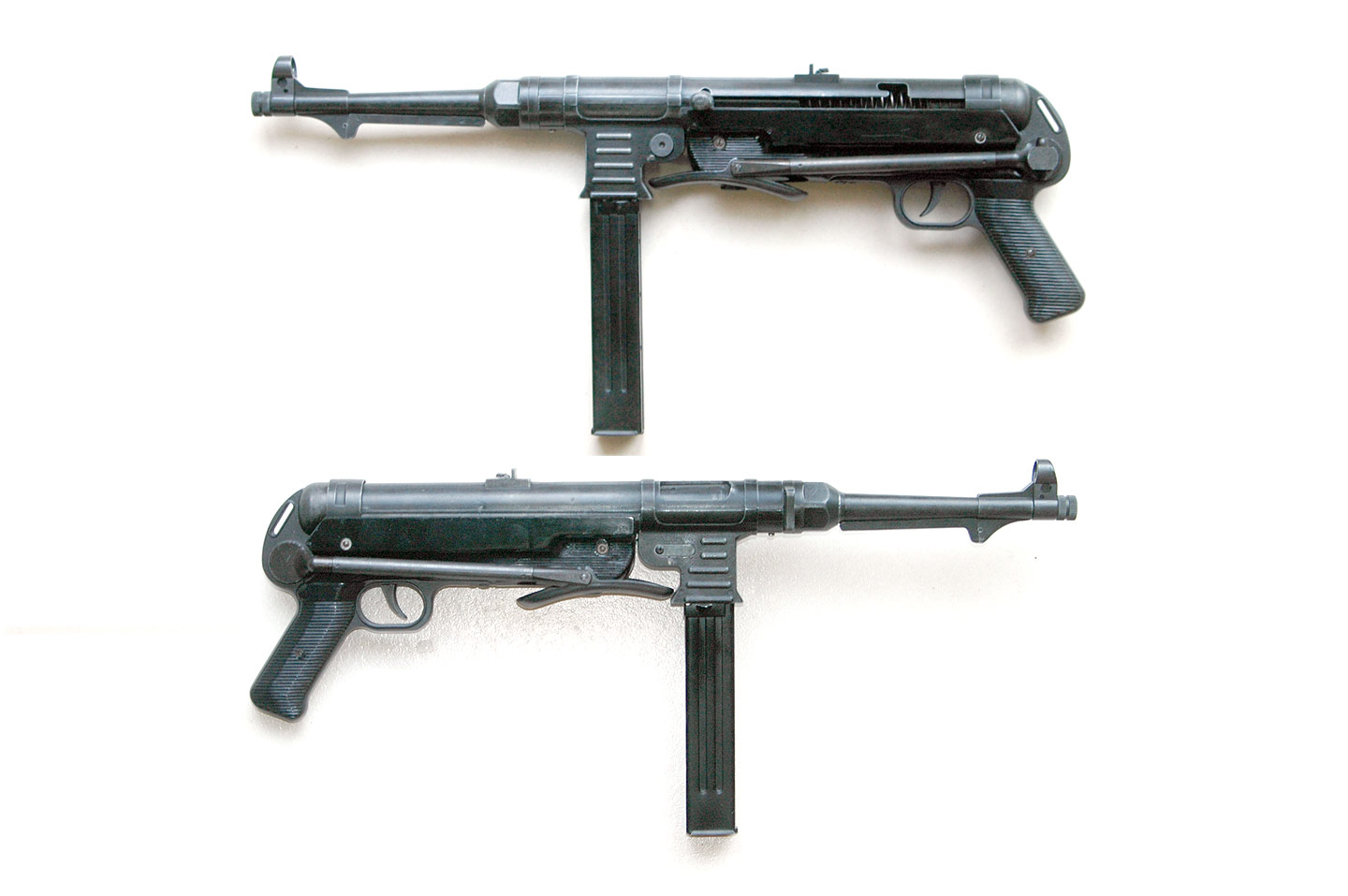 丸い管の中を重たい円柱状のボルトが動き回る形式は、サブマシンガンという新しいカテゴリーを 確立させました。その流れはイギリスのステンやスターリングに見られます。 MP40 は一見して形が違いますが、円筒パイプの中を円柱のボルトが動きまわるのは シュマイザーのMP18 と何ら変わりません。