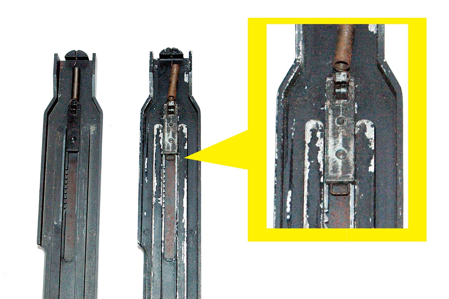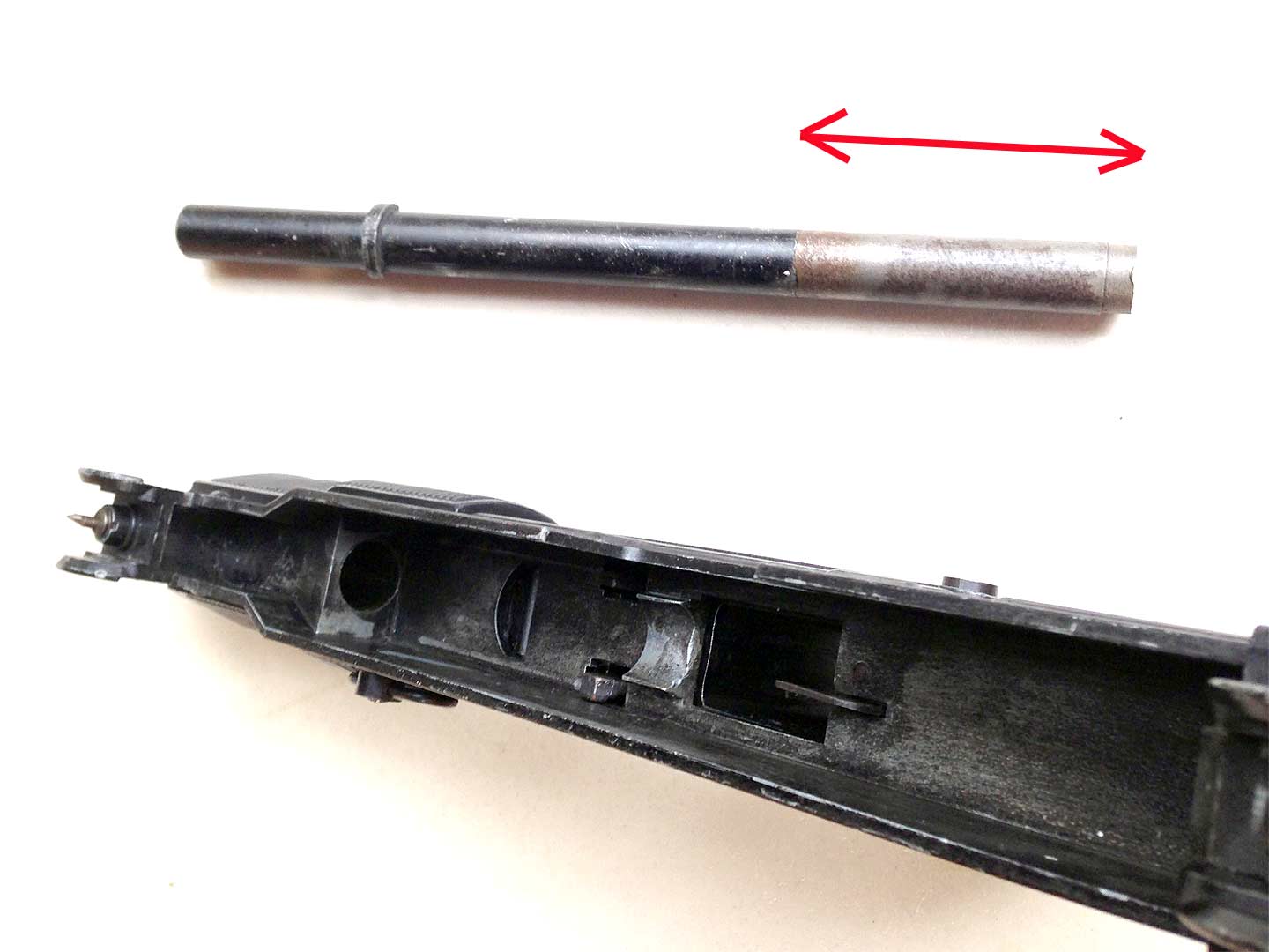 ボルトを保持するようです。おそらく本物での暴発防止装置なのでしょう。ボルトをいっぱいに引き切るとハリガネは引っ込み、ストッパーは解除されます。