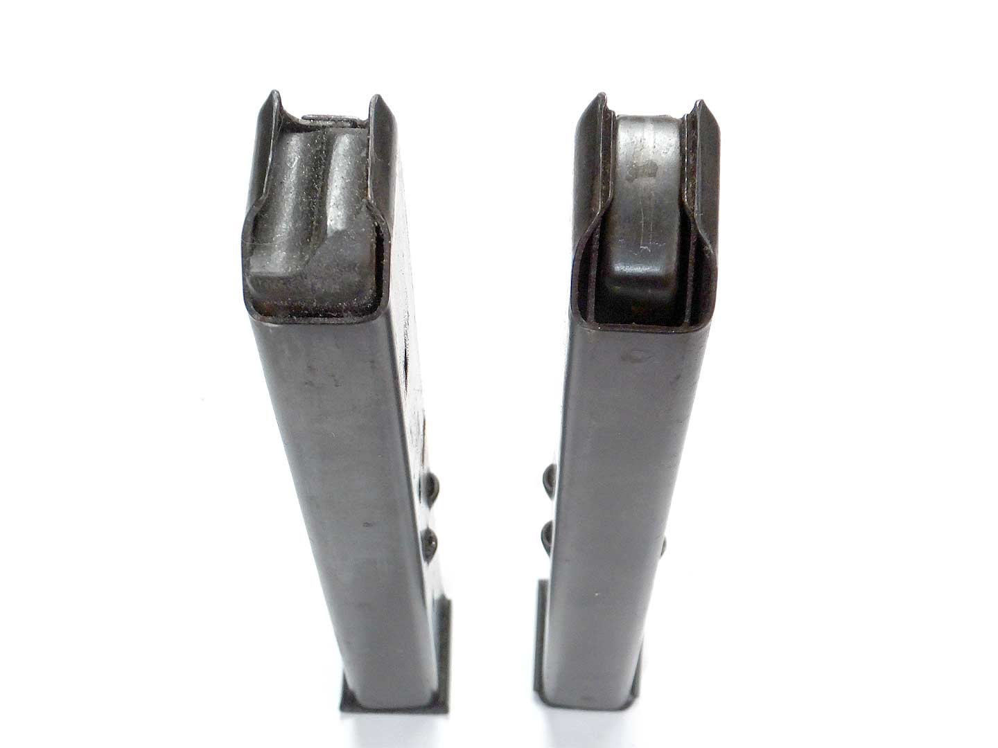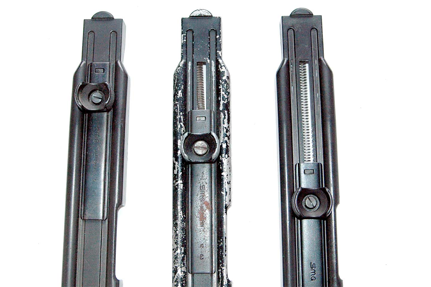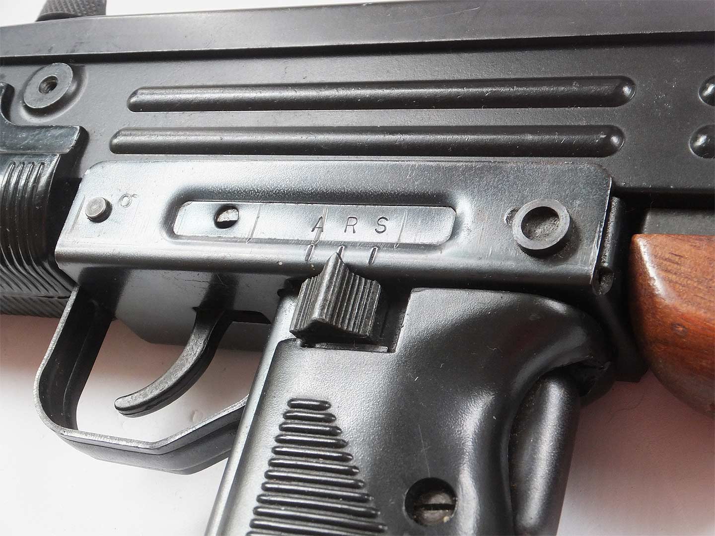 写真の物は、smg規制後のアルミフレームバージョンでマガジンはダブルカアラムです。バレルは、ご覧のようにバイパス付きの物です。