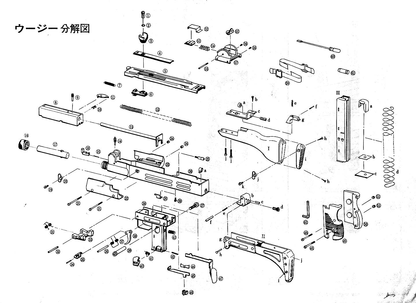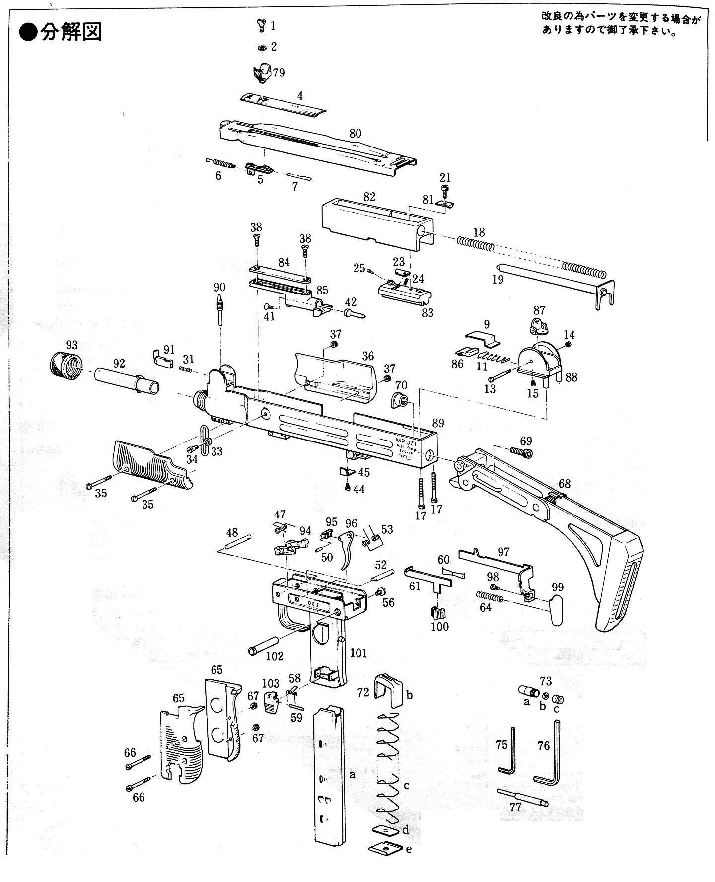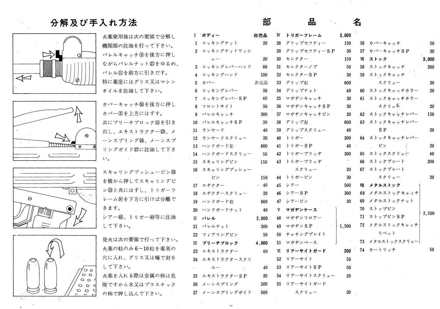 分解図は初期型の物でチャンバーとバレルが一体で、ボルトも一体型のようです。