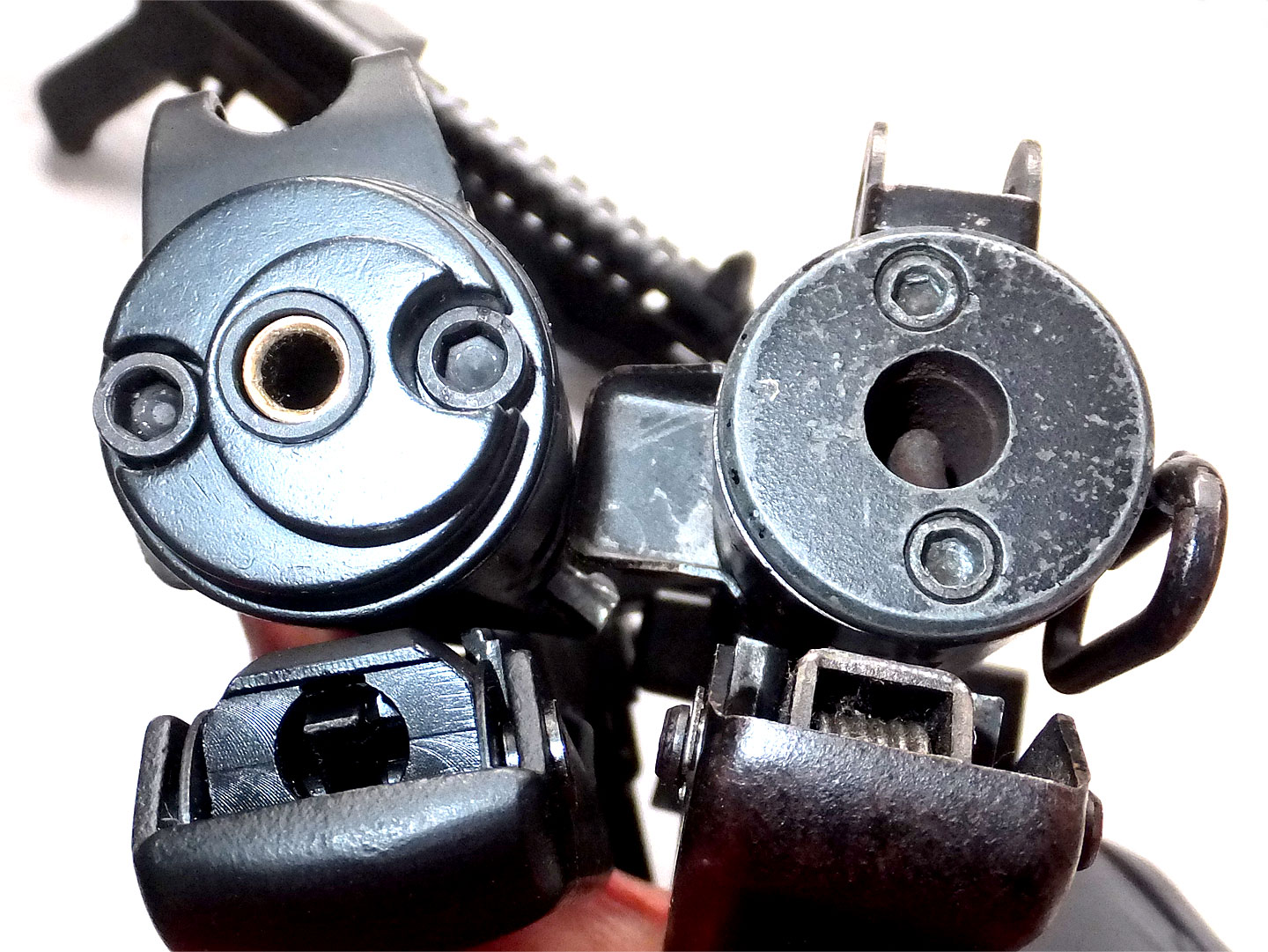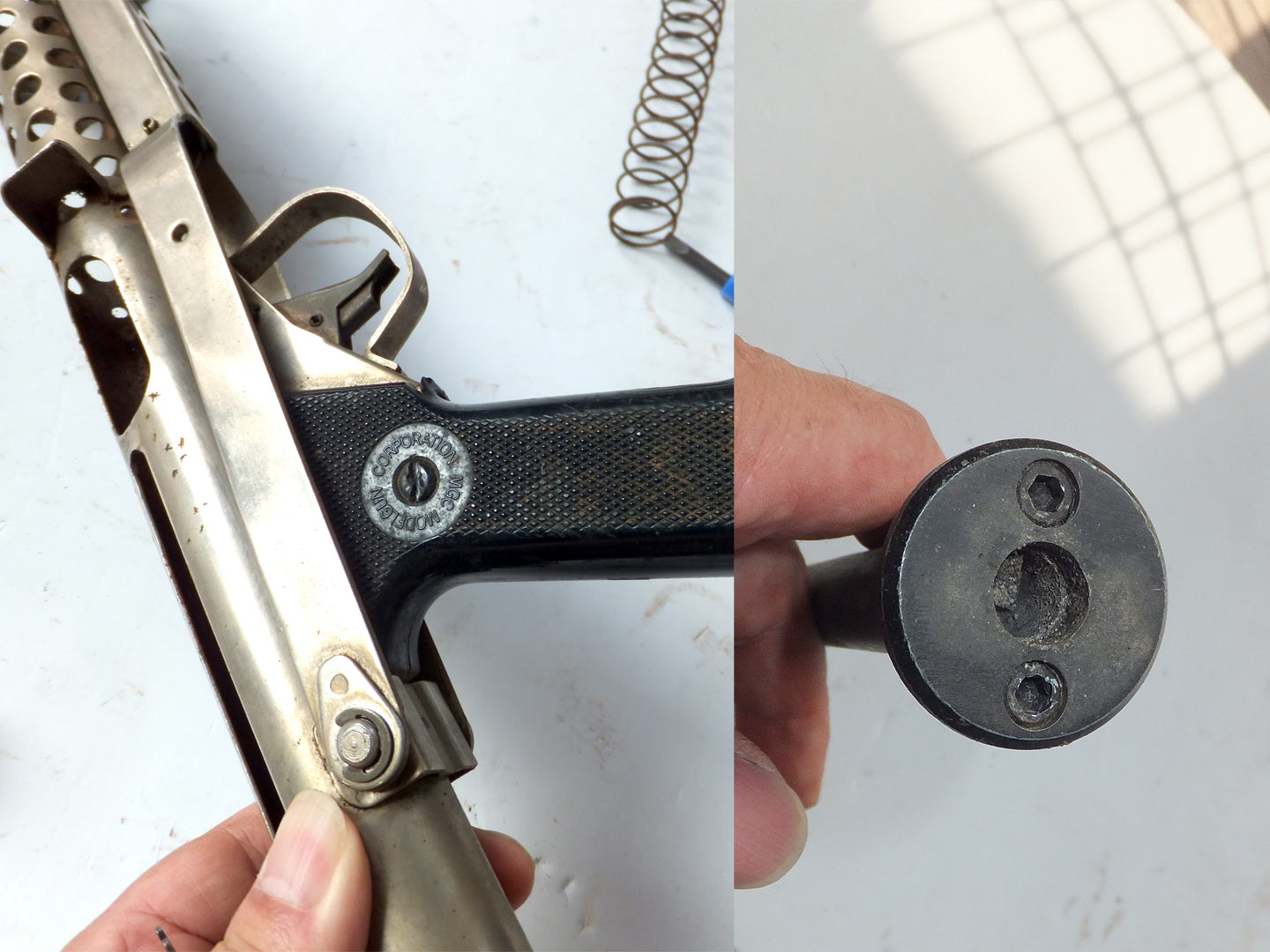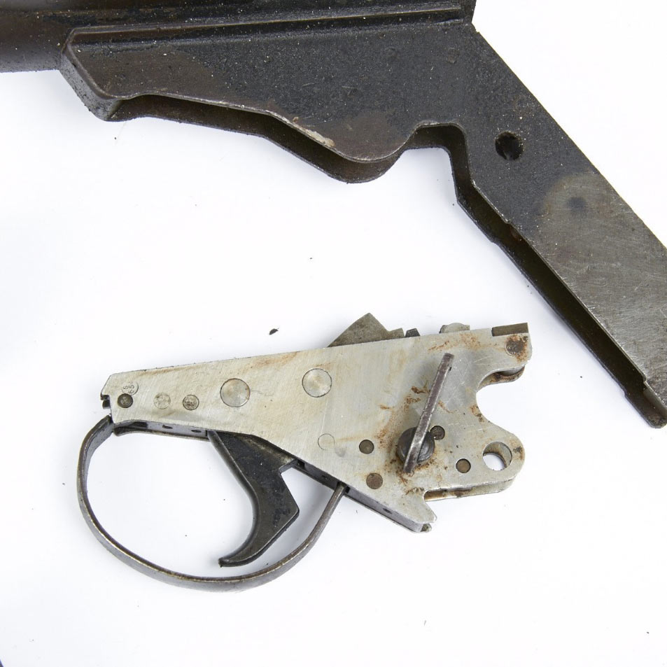 トリガーが亜鉛の物が初期型で、右の鉄板プレス品が後期型です。グリップフレーム内側も後期型にはサブフレームが入っているそうです??