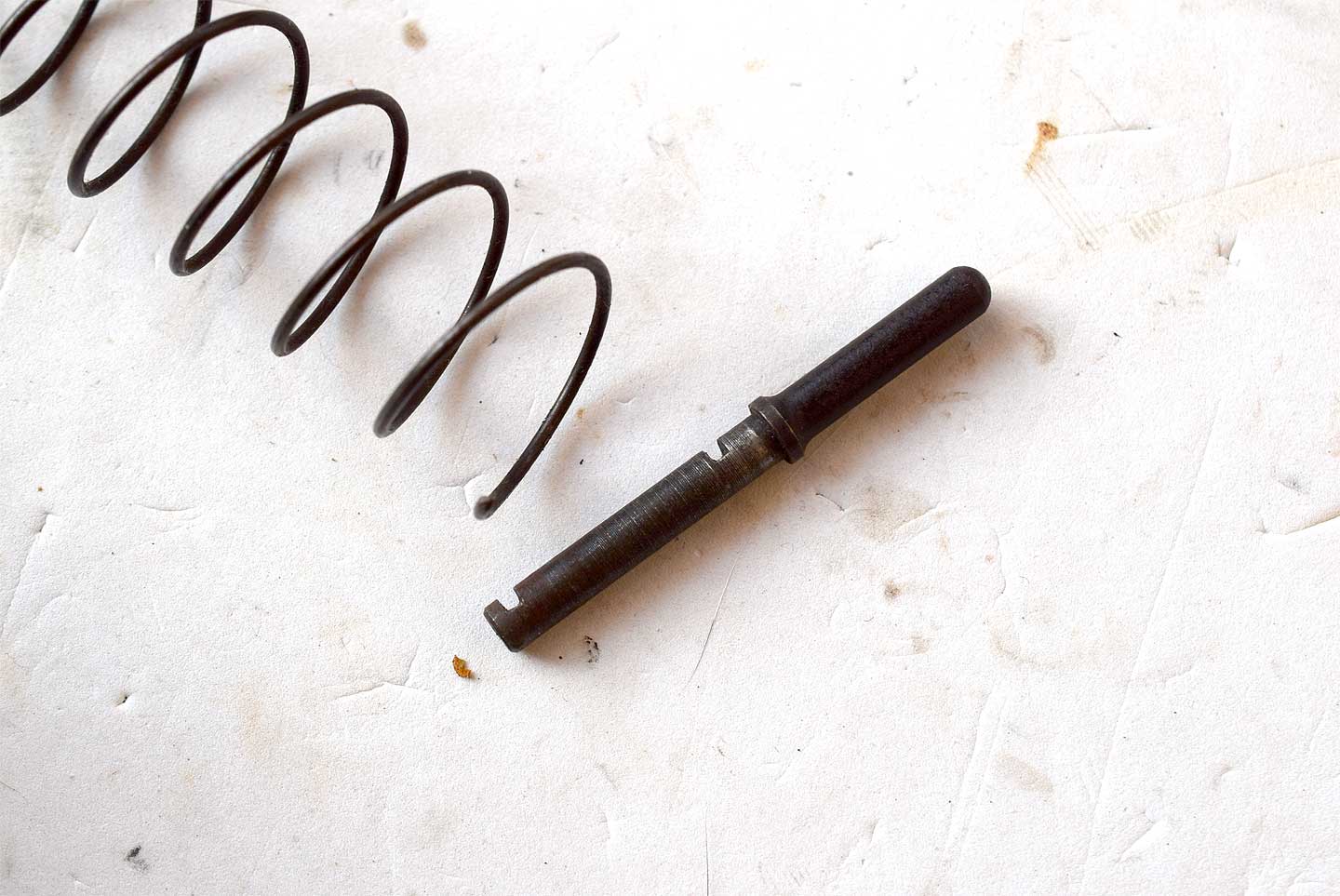 エキストラクターは鉄板2枚折りで丈夫に作られています。発火遊びが前提のようです。 ボルトハンドルは、実銃と違って真っすぐですが、普段は抜けないようにリコイルスプリング用のミゾが切ってあり それで抜けないようになっています。