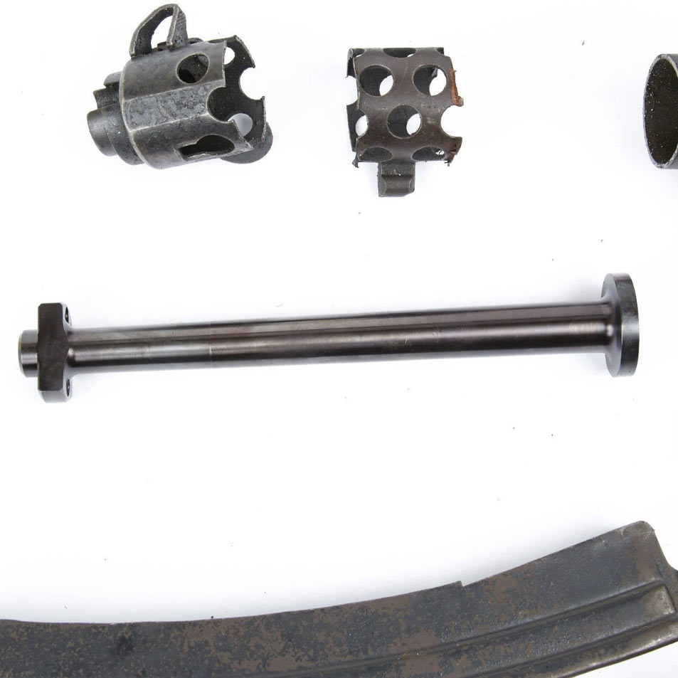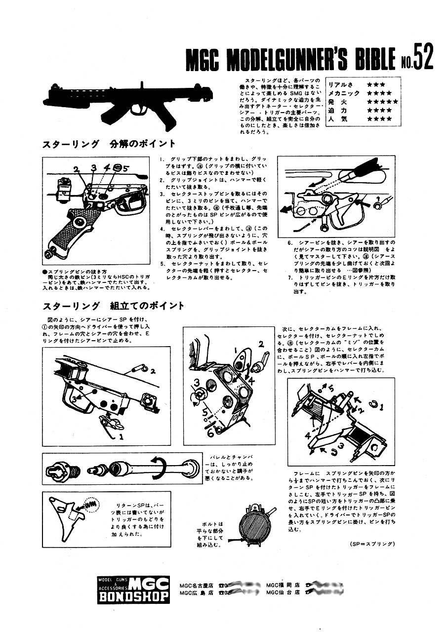 これらの写真は、アメリカで売られているスクラップですが、スターリングがサブマシンガンのロールスロイスと 呼ばれる意味が分かります。ボルトに刻まれたライフリングのような溝によってボディ内の砂などを落として 正常に発射されるようになります。またイギリス製には特殊な塗装がしてありサビには無縁となっています。 また、同じ9mmパラベラムを使用するMP−40やステンなどがダブルカアラム・シングルフィードなので いまいちマガジン性能が良くないのと違い、スターリングはダブルカアラム・ダブルフィードでしかも バナナ状に湾曲していてスムーズな給弾を約束しています。