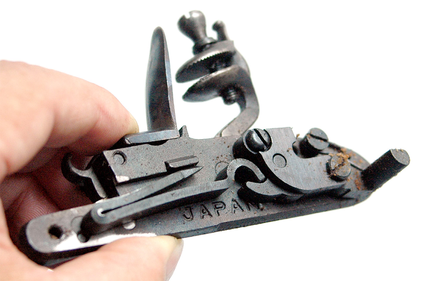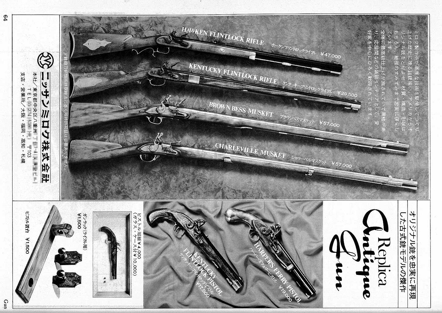また、実際に撃てるフリントロックモデルも製造していて、海外へ実銃として輸出されていました。 そのモデルガン版として、薬室下部切削、火伝ホール閉鎖、銃身閉塞など施した物を国内で 数種類のフリントロックライフル・モデルガンとして販売していました。 バレルは鉄ですが、鍛造されてはいなかったそうです。