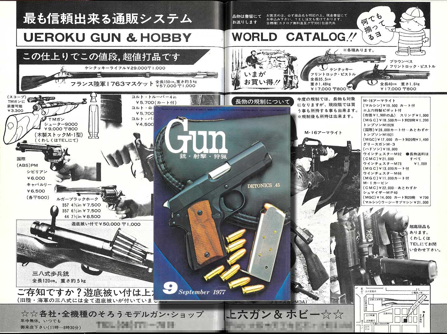 ここに挙げているのは、すべて1977年 10月号のGun 誌の広告です。なぜかこの号のみたくさん掲載されています。 1977年と言えば昭和では52年、そう悪名高き52年規制で銃身分離型モデルガンは販売禁止、材料規制で鉄製長物なども 販売できなくなったころで、各社とも売るものが無くって大変だった時期なのでしょう。