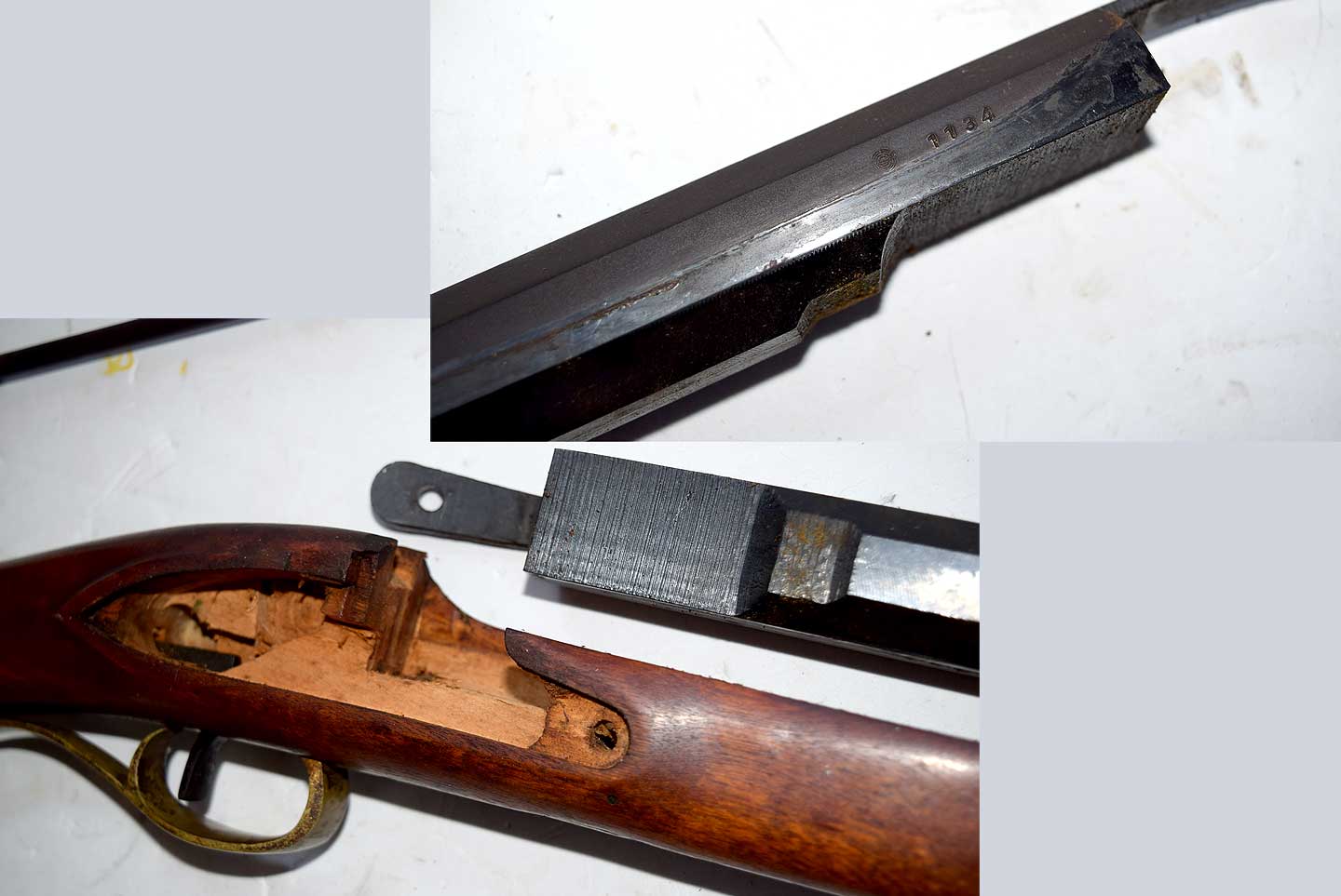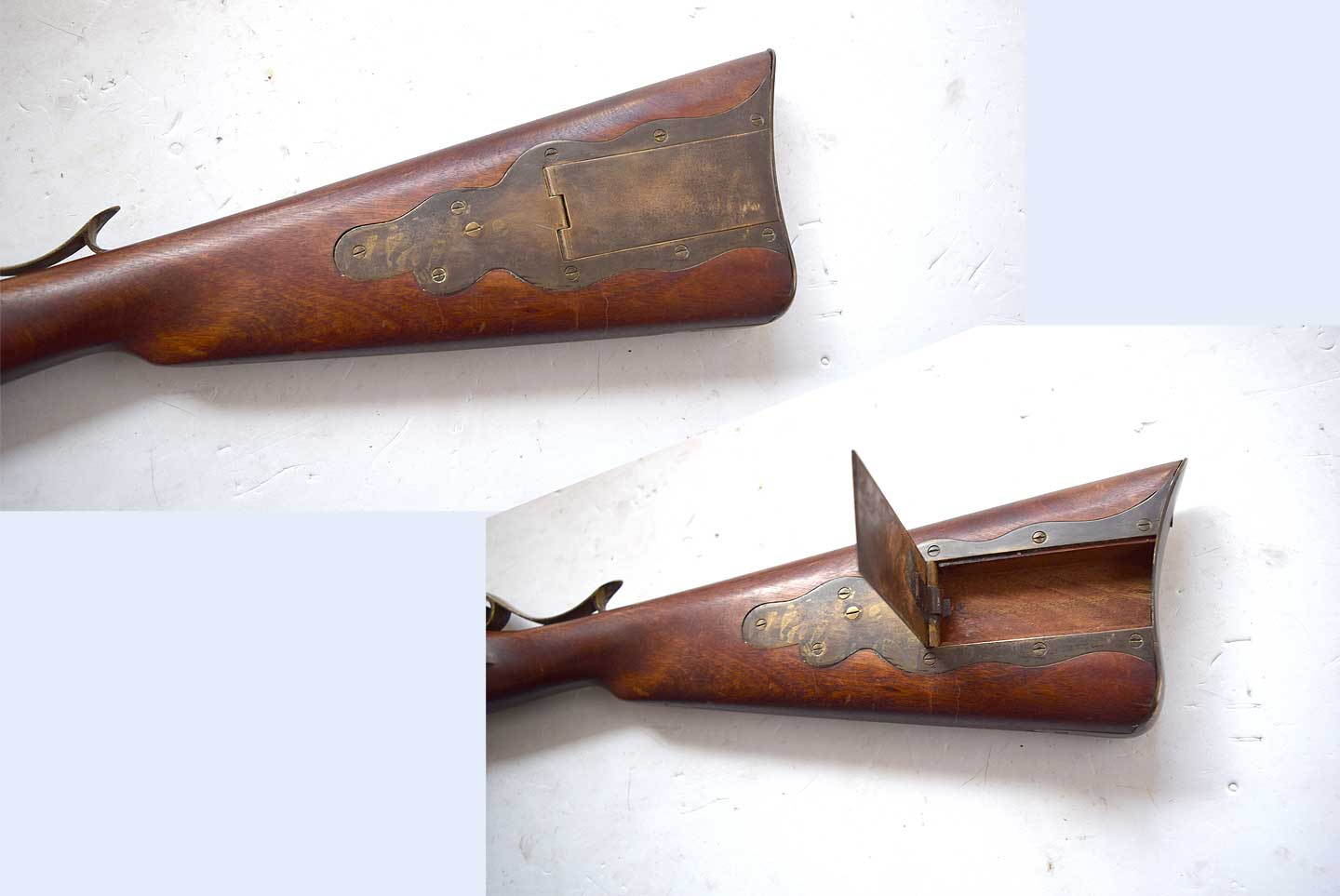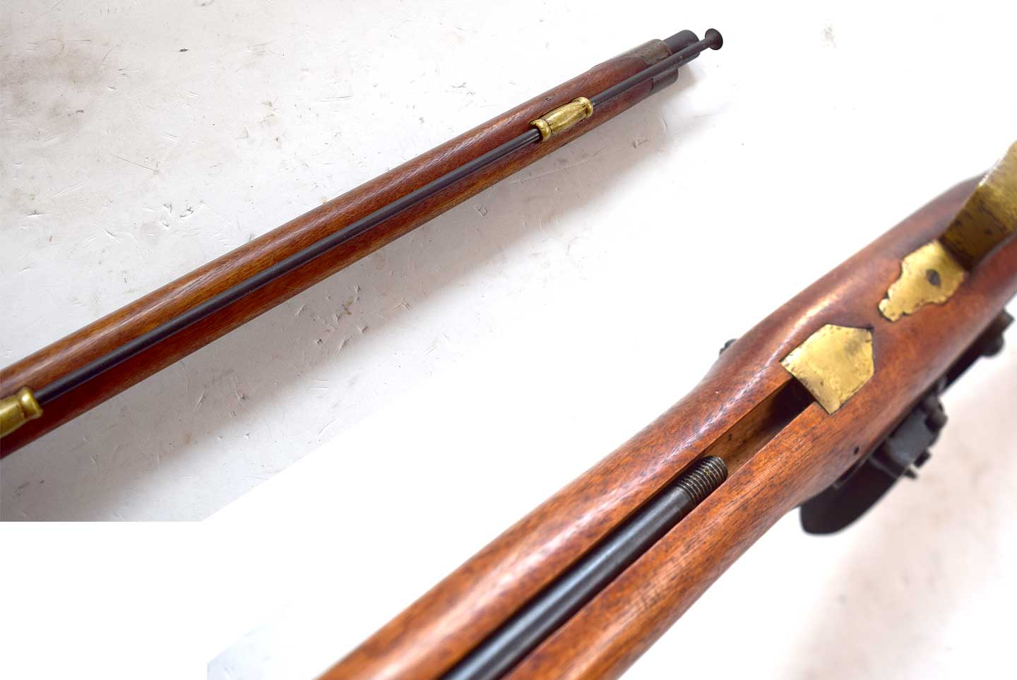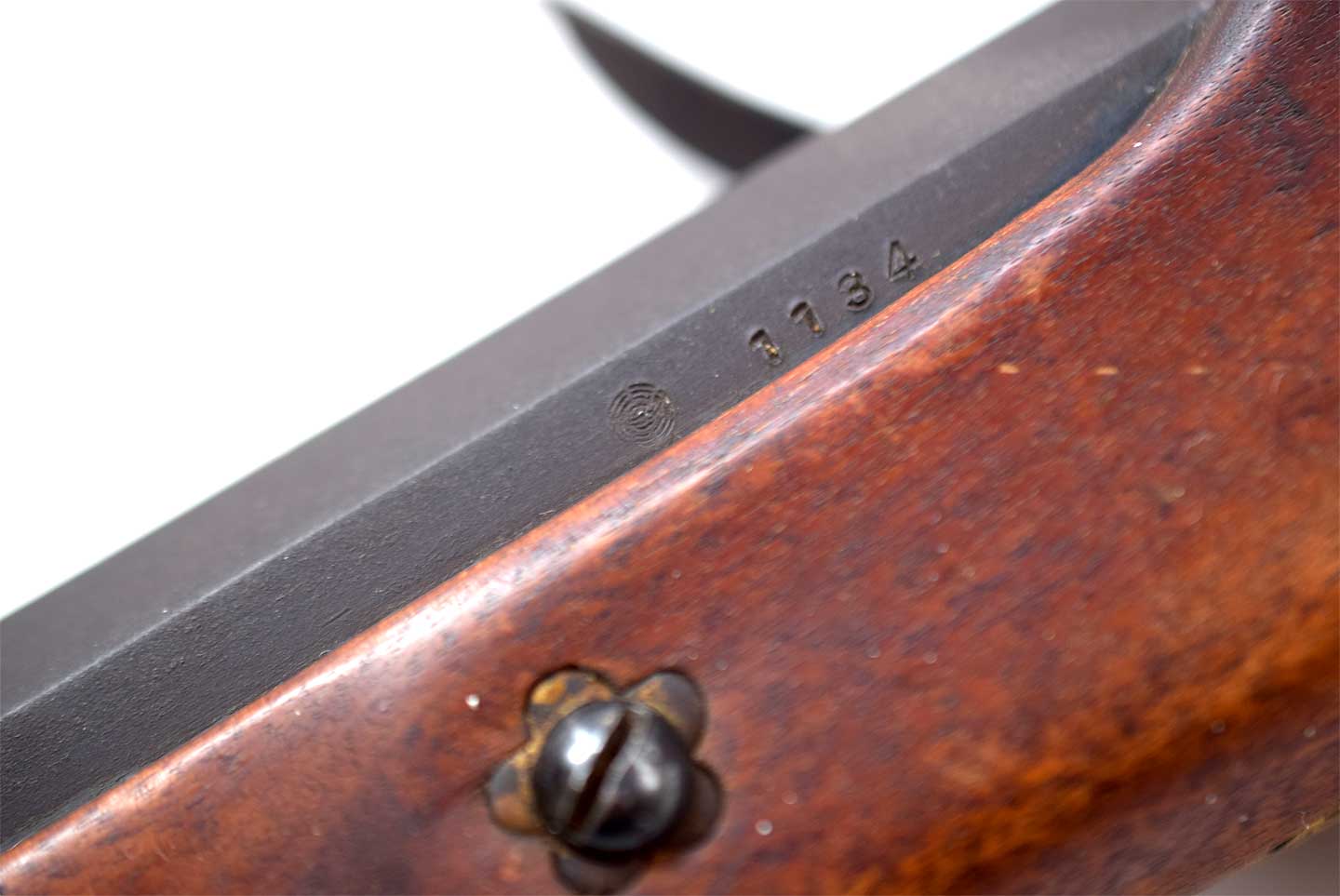 機関部にはチープな渦巻きが彫られています。機関部を止める左側には、ふつうよく見られるプレートは存在していません。 ラムロッドはスチール製です。パッチボックスはかなり大きいです。この個体にはニッサンミロクを表す刻印が彫られています。 また、機関部の王冠マークから言うと1969年〜1974年のあいだの製造だと言えますが、ニッサンミロクの 刻印から1972年以降の生産だと思われます。
