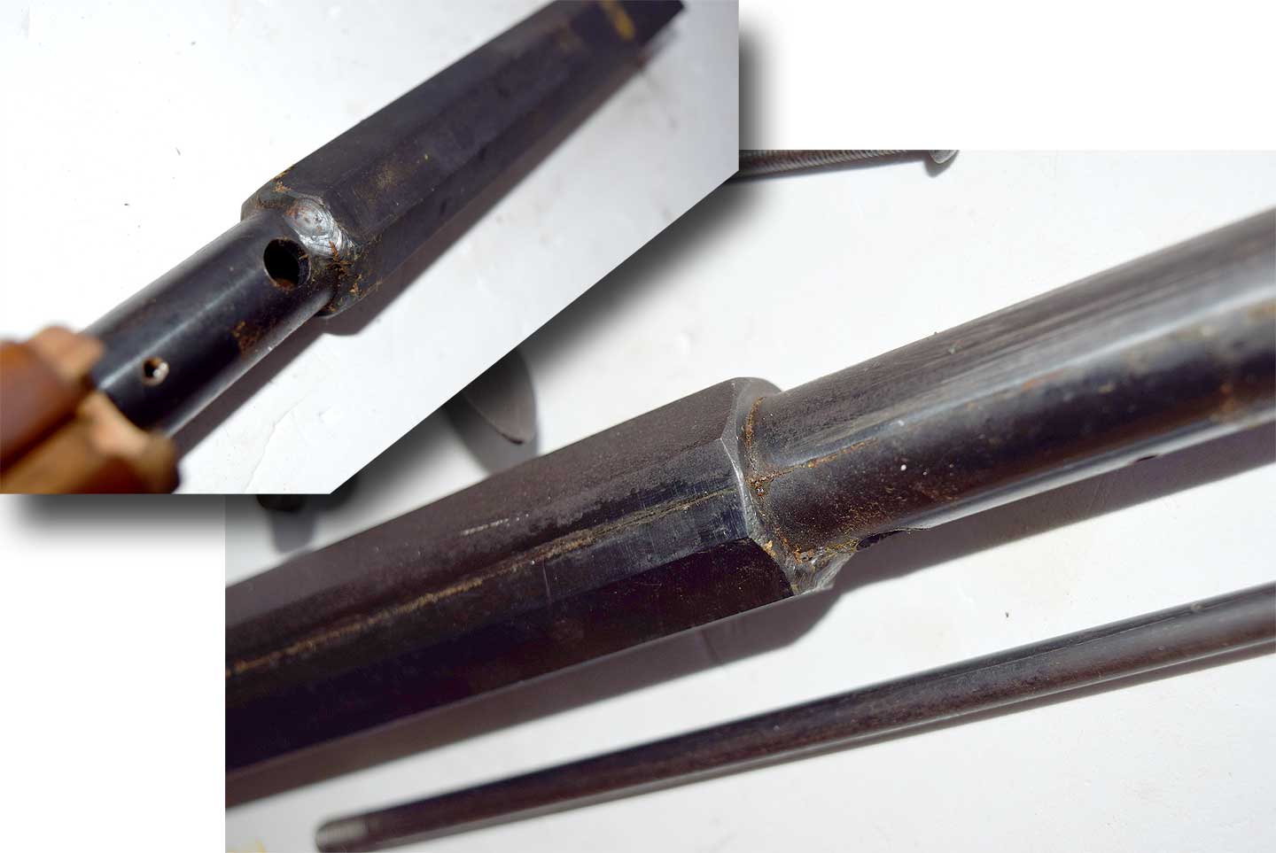 八角バレルとラウンドバレルは溶接でつながっています。私はずっと八角バレルを途中から切削しているのだと思っていましたが 大間違いでした。八角部分はスリーブ状になっているのでしょうか。溶接してから穴彫っているのかな? もしも出来上がったバレルにスリーブを溶接したら、バレルがひずんで一直線では無くなってしまい、弾がどこに飛んでいくか分かりません。いやいや点付けだからこの程度はOKなのかな?