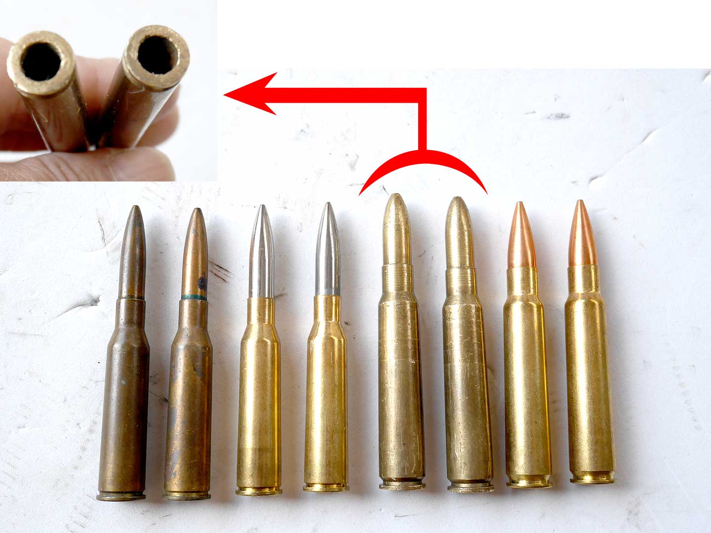 これまた純正なのかは分かりませんが、7.7mm弾のようなカート2発が付属していました。写真の左から実物6.5mmダミー2個、ノルマ社のダミー2個、ミロクカート2個、ノルマ社7.7mmカート2個です。ミロクのカートは内側がえぐられています。