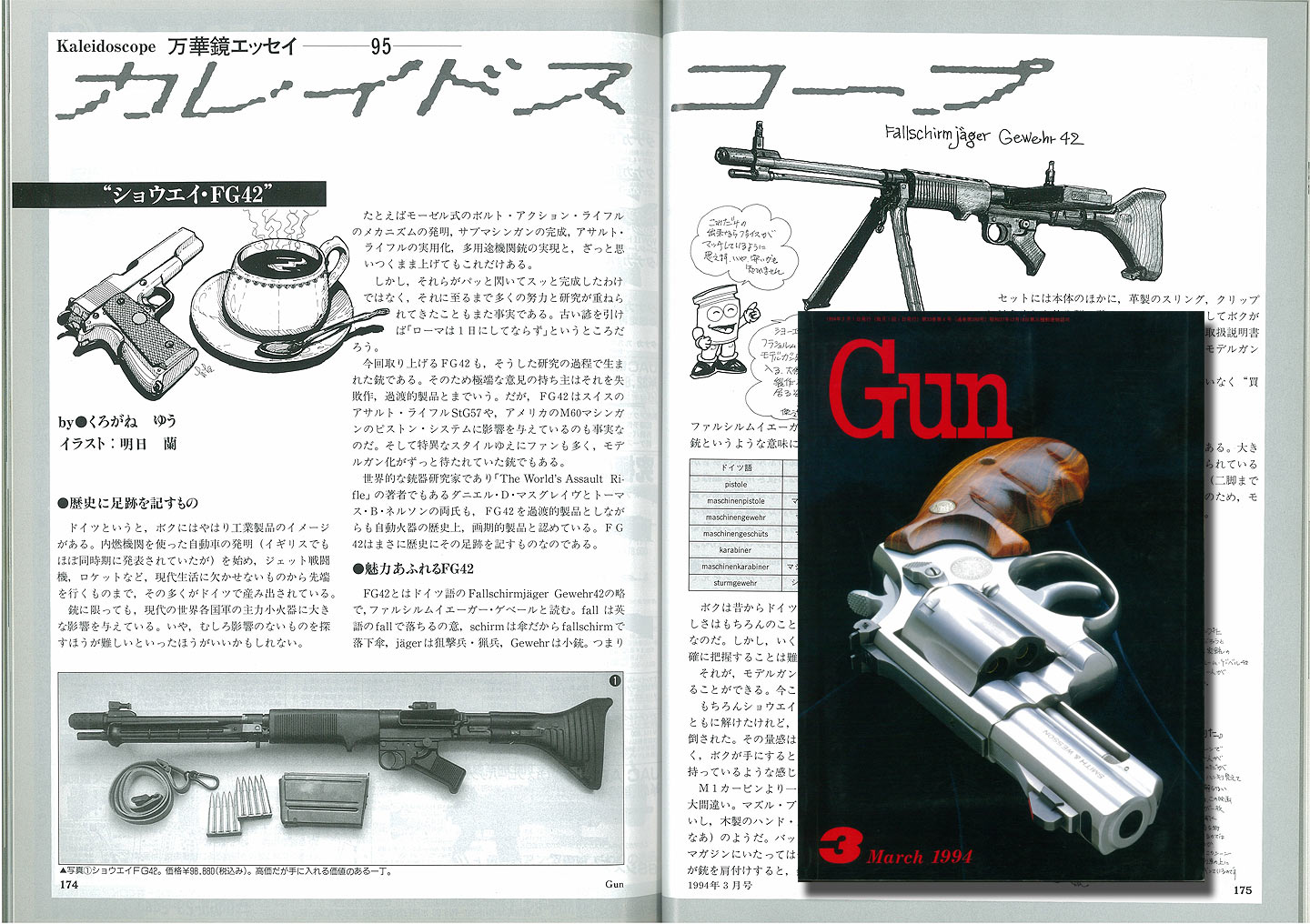 翌月にはショウエイの単独開発だと訂正されています。おぉっと、その4月号に1993年のトピックスとしてFG42 の発売が挙げられていました。 と、いうことで1993年に登場したものでしょうか。下記のように94年のガンズダイジェストに載っていなくて 95年に掲載されていますので、93年の終わりから94年の初めにかけて発売されたのでしょう。
