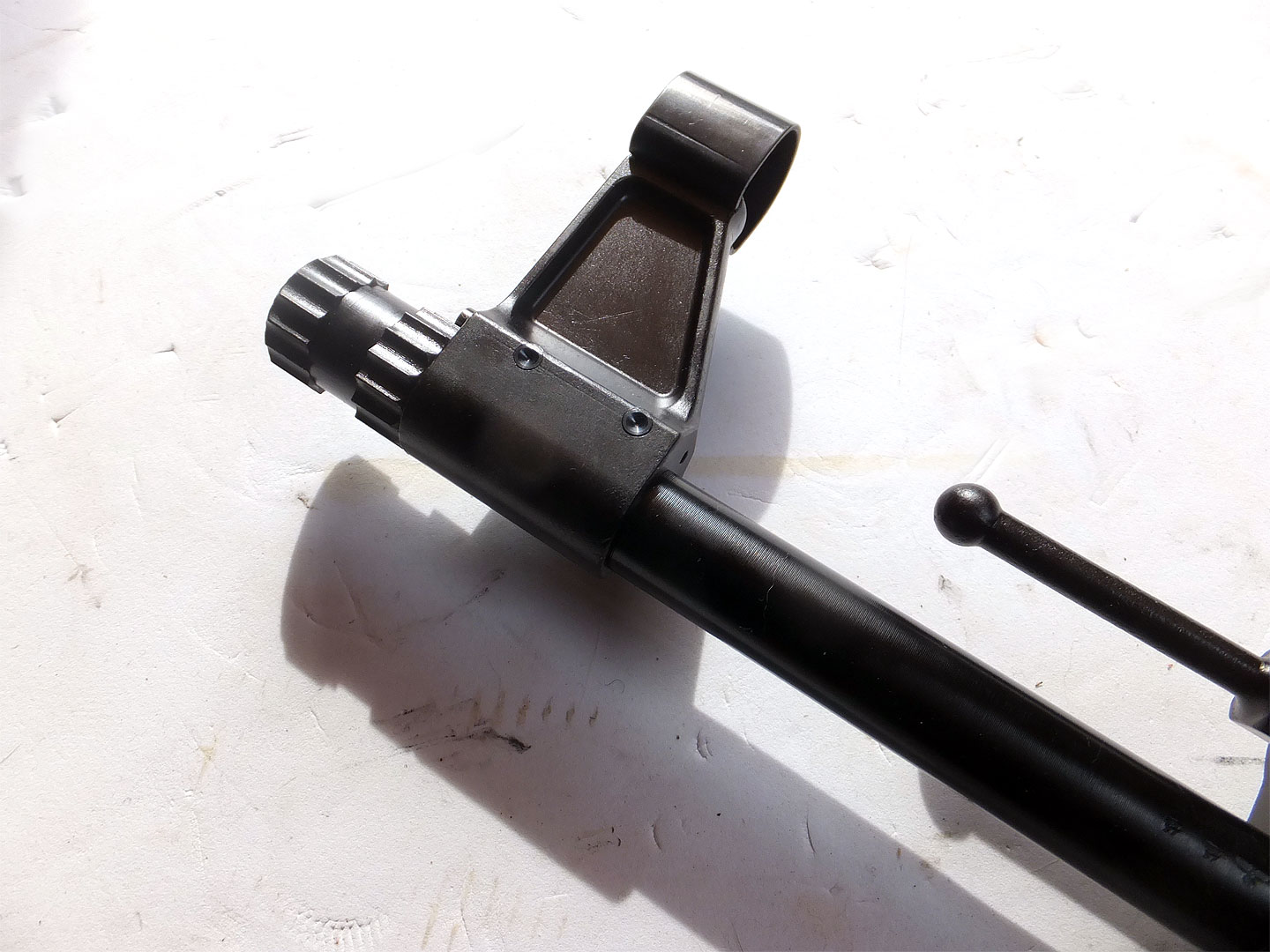 実銃のMP 43/1 は、MP43 よりも前の生産だそうで、リアサイトのスコープ用リブが他のモデルに無い特徴です。これは 試作銃のMkb 42(H)から引き継がれています。 銃口のネジを外すとグレネード発射器をネジ込めるようになっています。