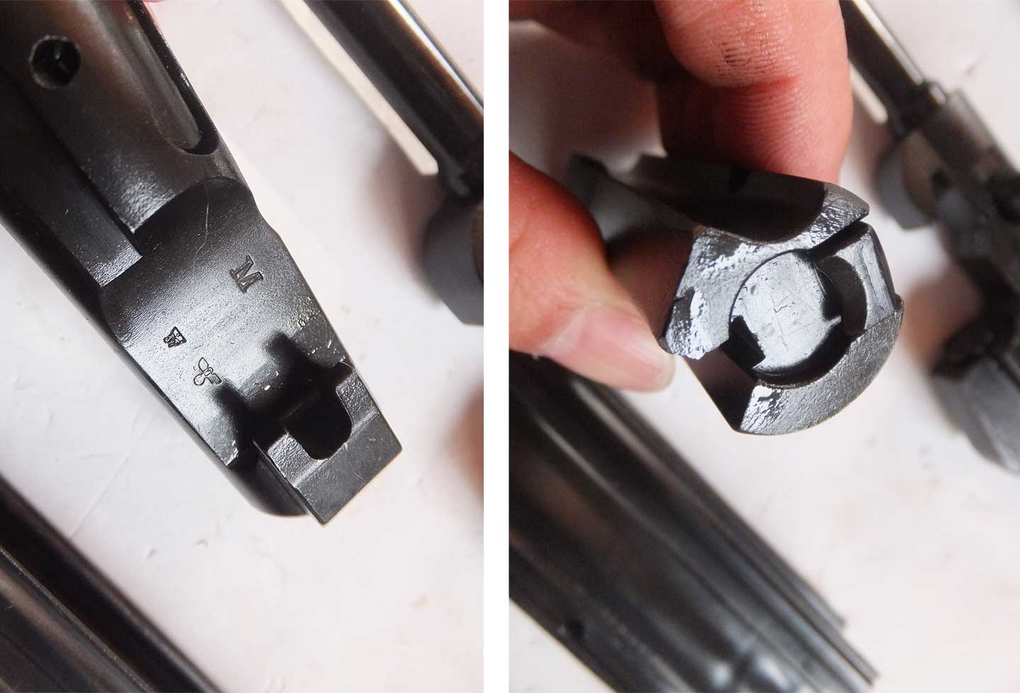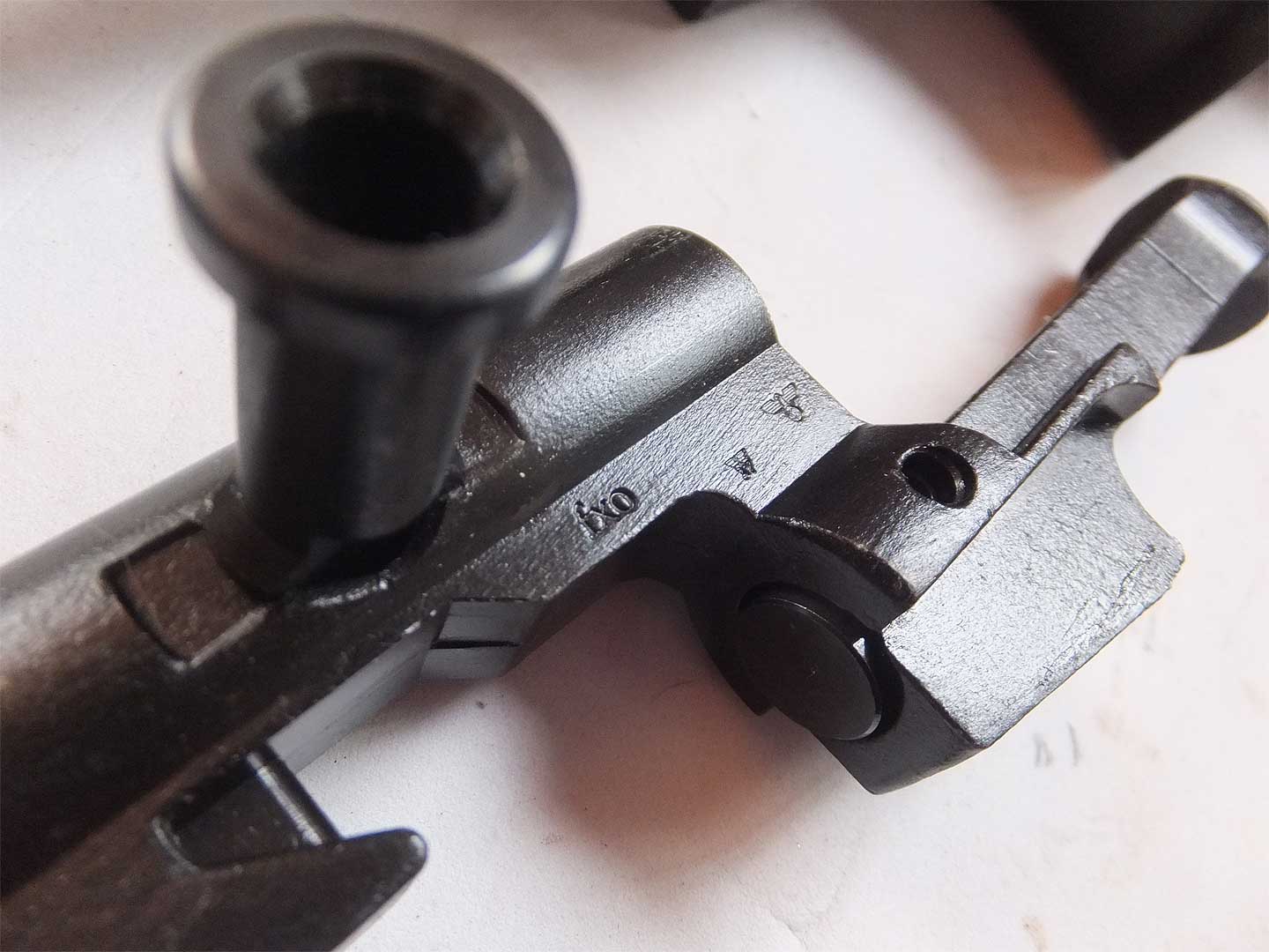 普段は見えない部分のボルトキャリアにも丁寧に刻印が入っています。ボルトの頭はツルツルで実物のように 撃針の穴は開いていません。キャリアにあるマーキングfxoは、ハーネル社を表します。