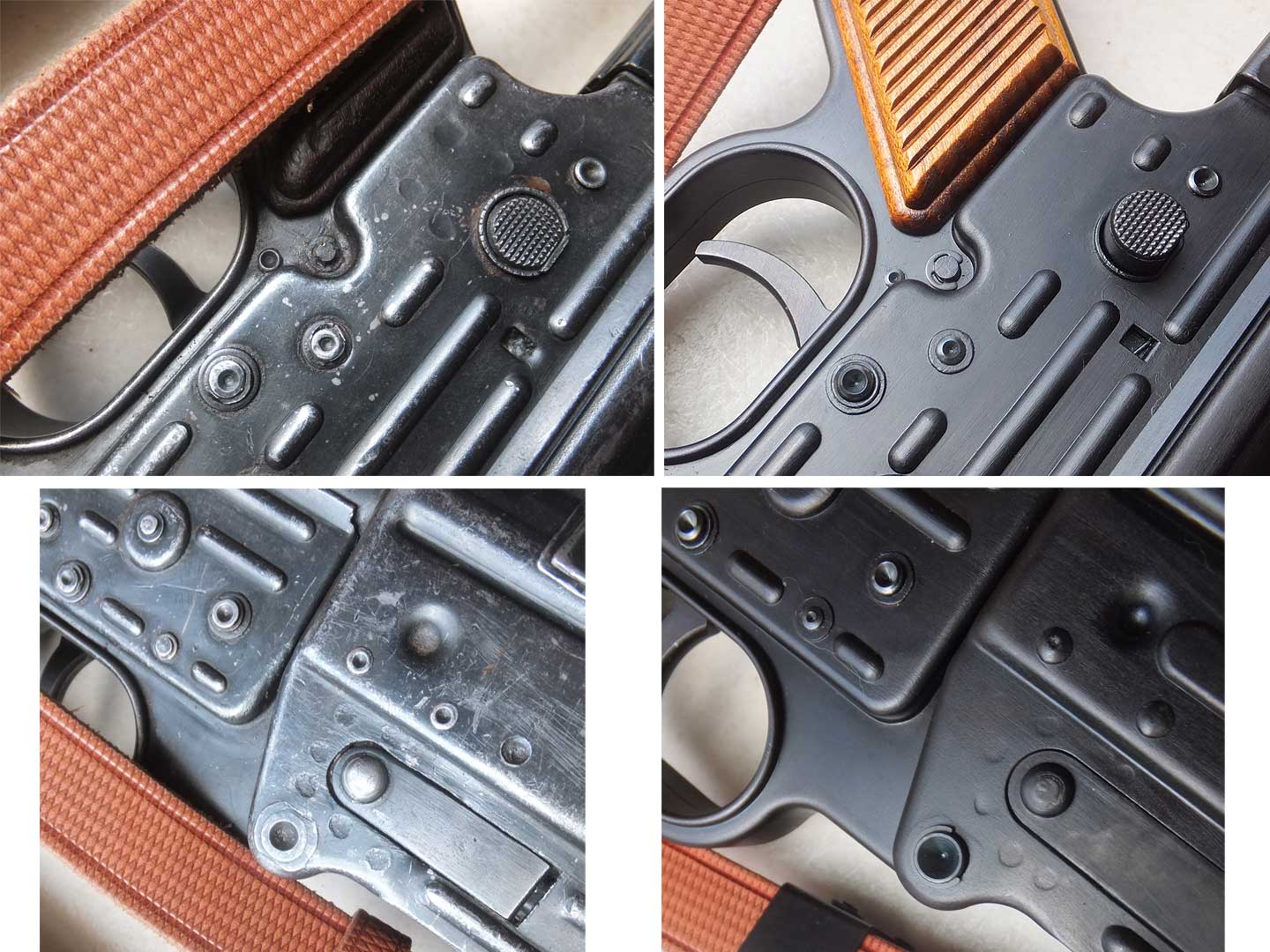 松栄さんでもモデルアップするときに悩んだそうですが、結果実物同様にカシメて再現されています。ただし、実銃と違いグリップ部分は回転軸を外せるようになっているのですが、傷が入りそうなので実行していません。またハンドガードは、ただ、はめ込んでいるだけで、金属板の摩擦だけで保持されています。 プレスを実銃同様に整形しているからこそ再現された姿です。