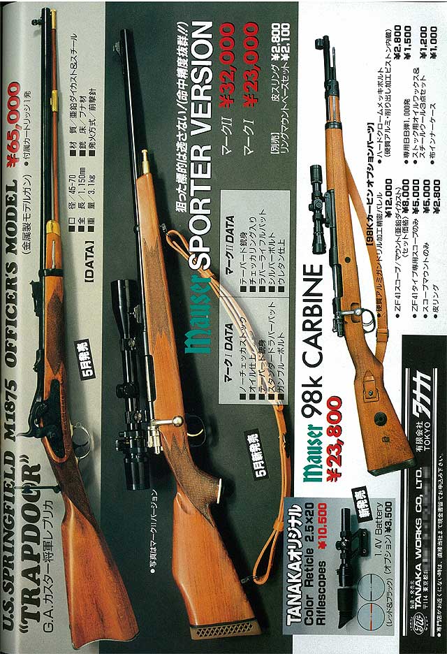 Gun誌の広告から見ますと、最初は普通の騎兵銃が発売され、翌年にジェロニモの2タイプが販売されました。 さらに翌年には、10cm長いライフルタイプも販売されました。これはレアですね。なかなか見ることは 少ないモデルでしょうね。 いずれもチェッカー入りストックの仕上げはたいへん良かったそうです。↓クリック拡大します。