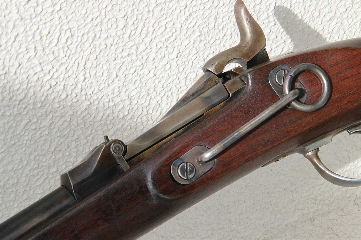 アメリカ人って言うのは、先進的な部分と強い保守的な部分を併せ持っているようです。 この機関部を見ると「とりあえず間違いないマスケットの部品を使ってセンターファイアを 作ろう」という発想が見て取れます。リスク・ファクターを少しでも減らす良い方法だと思います。