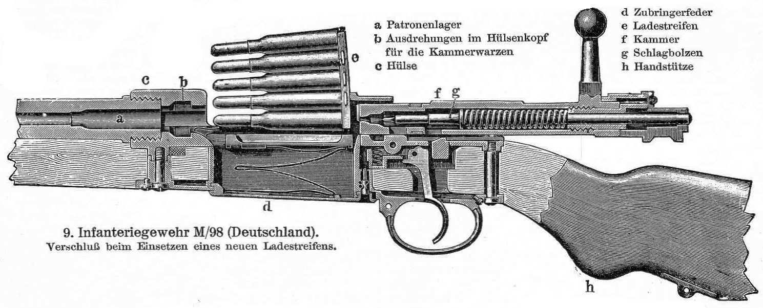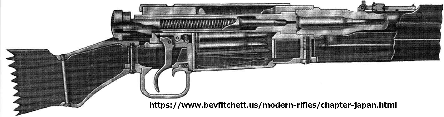世界的におそらく最も作られたであろうモーゼルアクションの断面図です。 ロアタングは伸びていませんね。日本の三十年式小銃の最初の絵と変わりません。 アメリカの1903ライフルでもガランドでもタングは短いです。