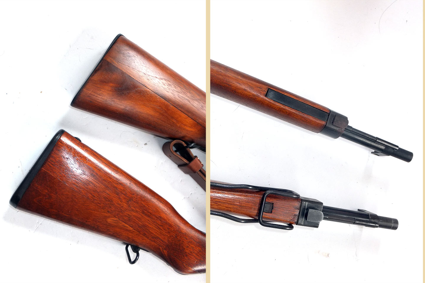 バットプレートは、Kar98 の後期型のようにカップ式になっています。またクリーニングロッド止めは変更になっています。 どちらのモデルガンも形だけコピーしています。ロッドを止める実物の機能はありません。