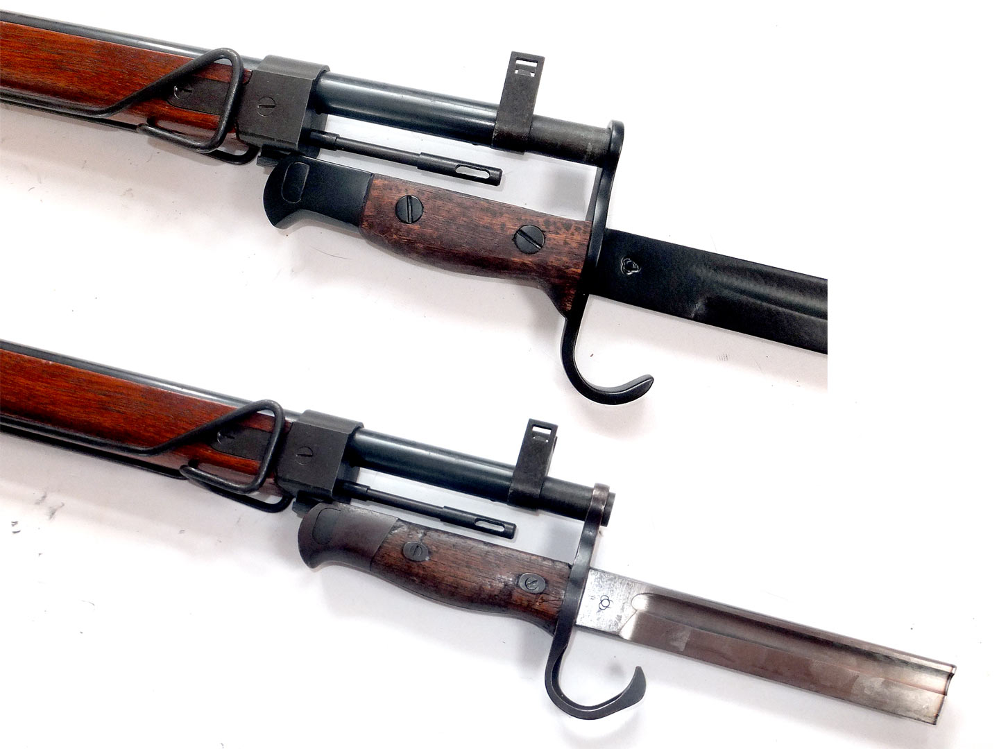 写真の上がウインドラスのレプリカ銃剣で、下が本物ですが、両方ともロック位置まで装着できません。 どちらも長小銃の方に着剣しています。