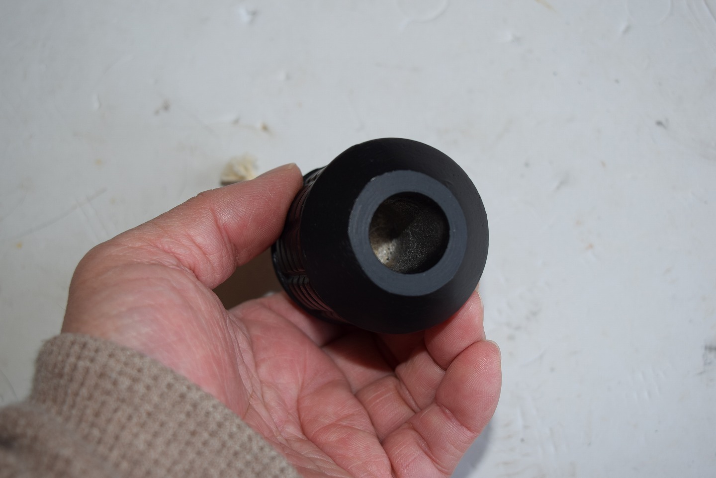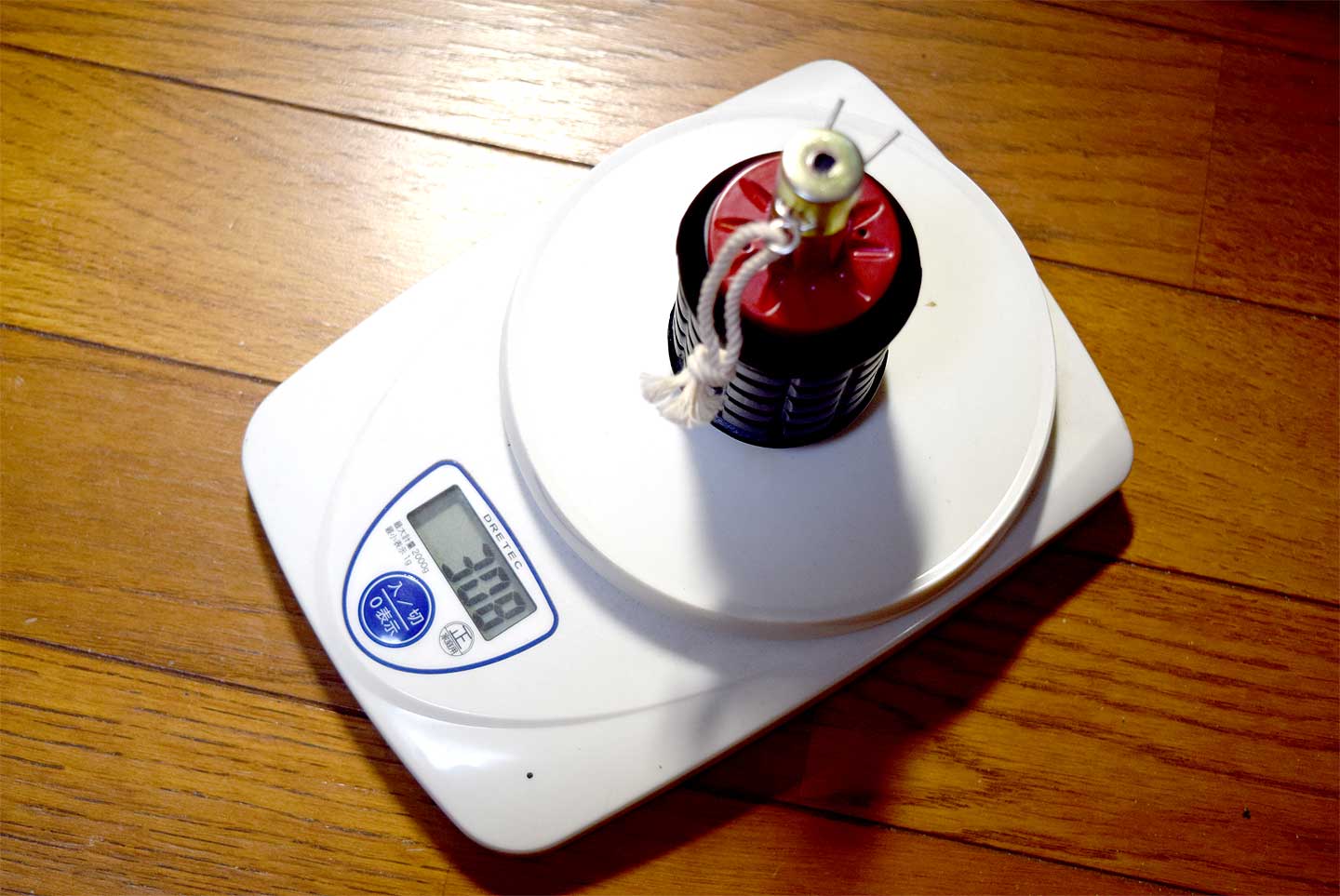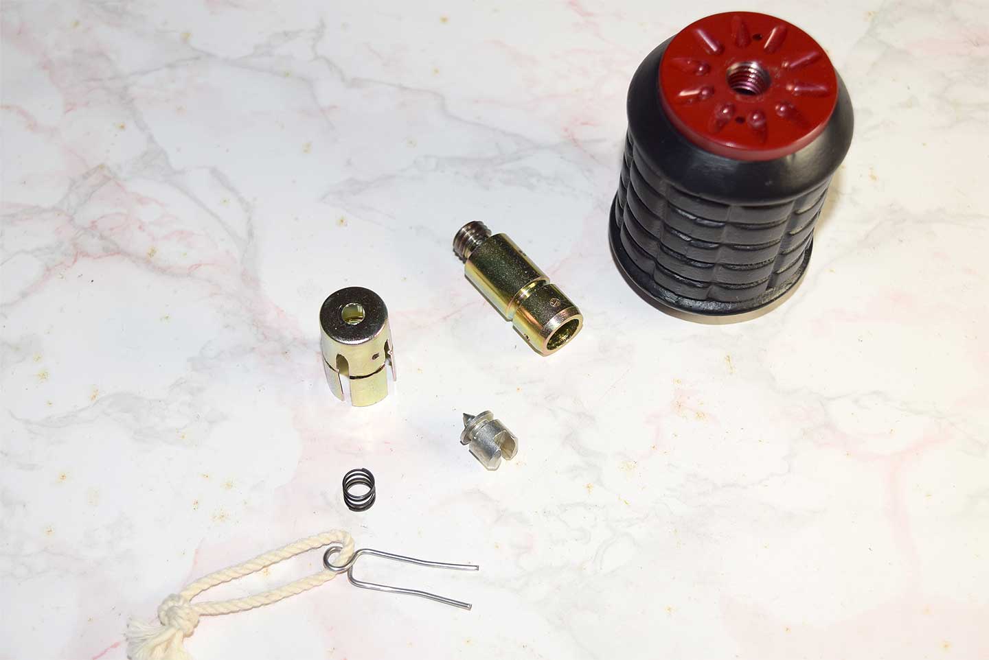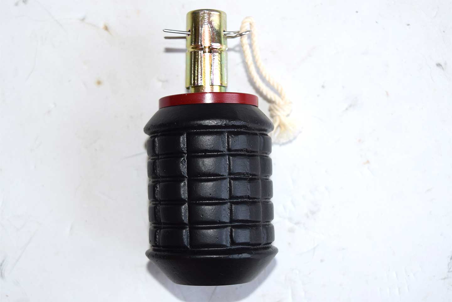 亜鉛合金?製のようですが、そこそこ重いです。偽物である明示なのか、重さ調整なのか底に穴が開いています。 また、右写真のように首のガスが噴出する穴まできちんとコピーされています。 投げる前にガスでやけどする可能性があるグレネードって日本製だけだったのではないでしょうか?