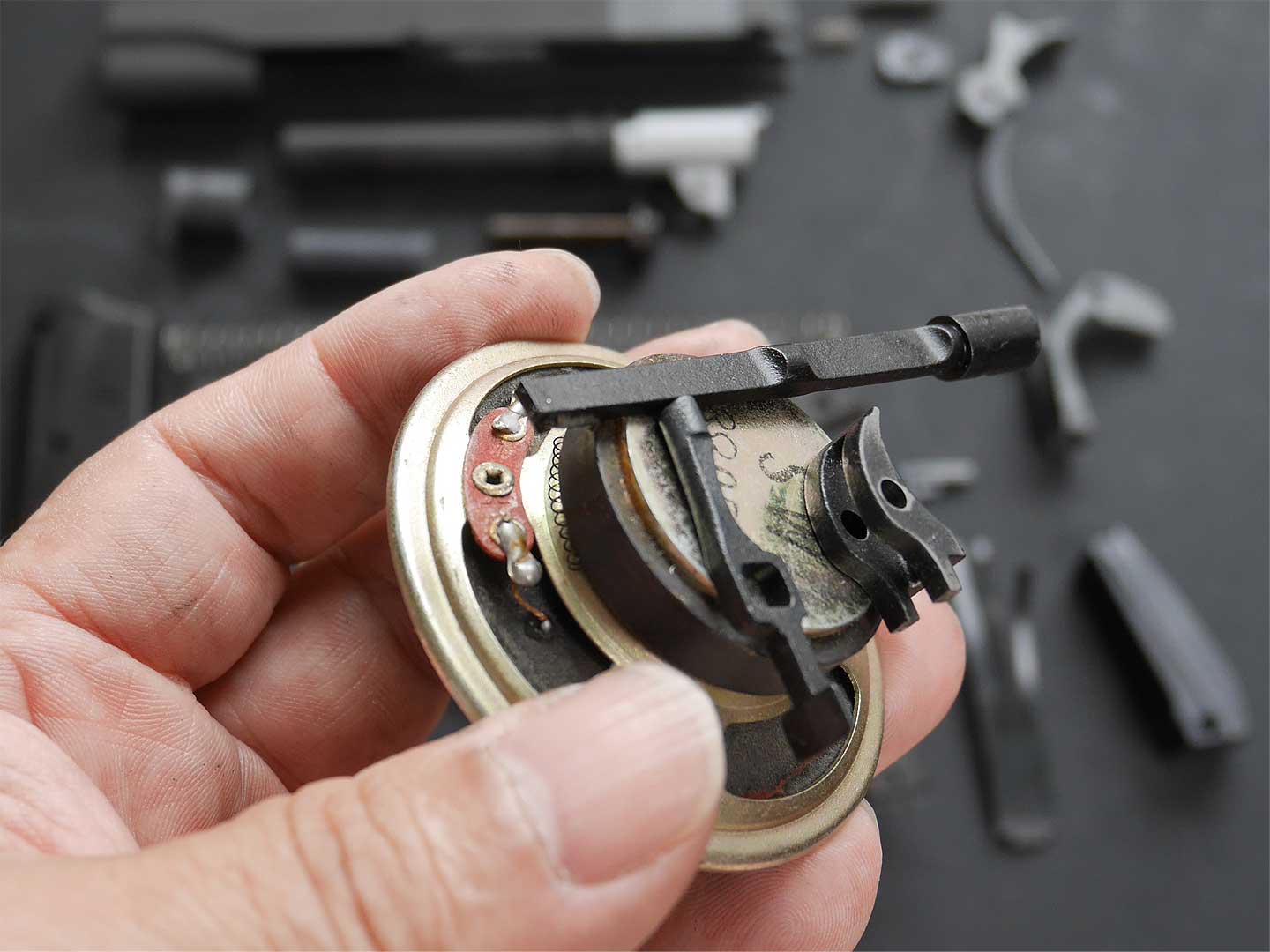 ナショナルマッチのリアサイトとハンマーは、亜鉛崩壊していたので他社の物と組み替えています。今まで3個体を 手にしましたが全部そうでした。オークションで見かけるものもたいていの個体は亜鉛崩壊しているようです。