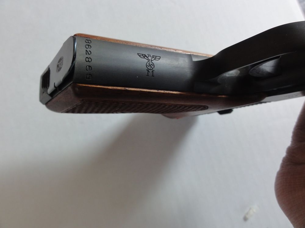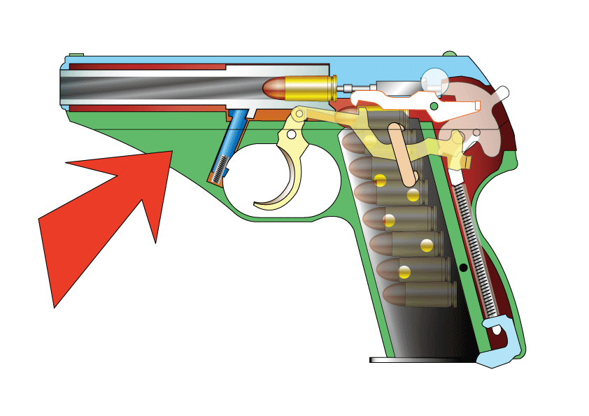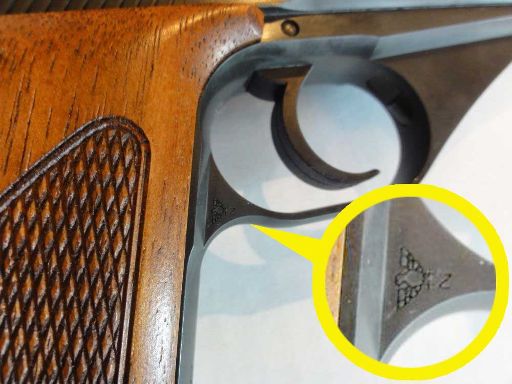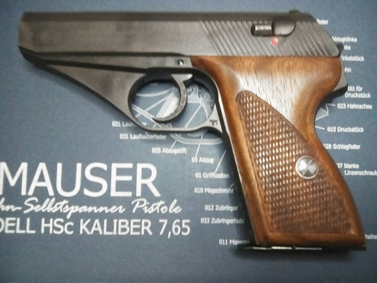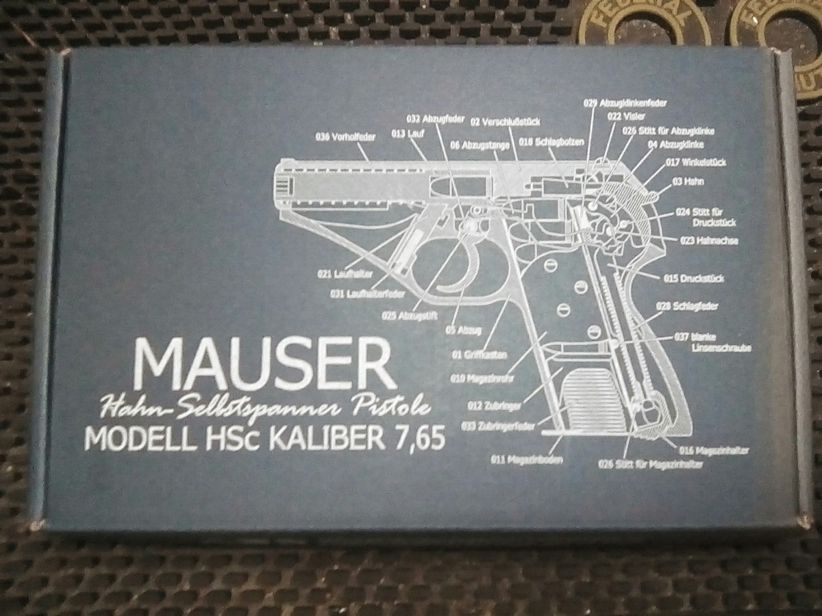 本物は、すこしでも軽くするために肉抜きされているのですが、モデルガンでは逆にそこに鉛で出来たおもりを 挿入しています。上のイラストは大戦中のドイツ警察本からですが、戦後生産のHSc ではフレーム後方が分割式に 変更されています。 戦前形状は削るのが大変そうな形状ですものね。