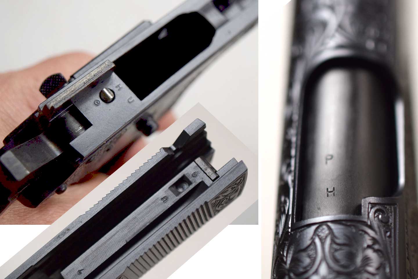 実物はコマーシャルモデルですが、モデルガンの方は、軍用モデルですので右側刻印が実物と大幅に違い一行刻印なので、それに伴い彫り方も変えています。