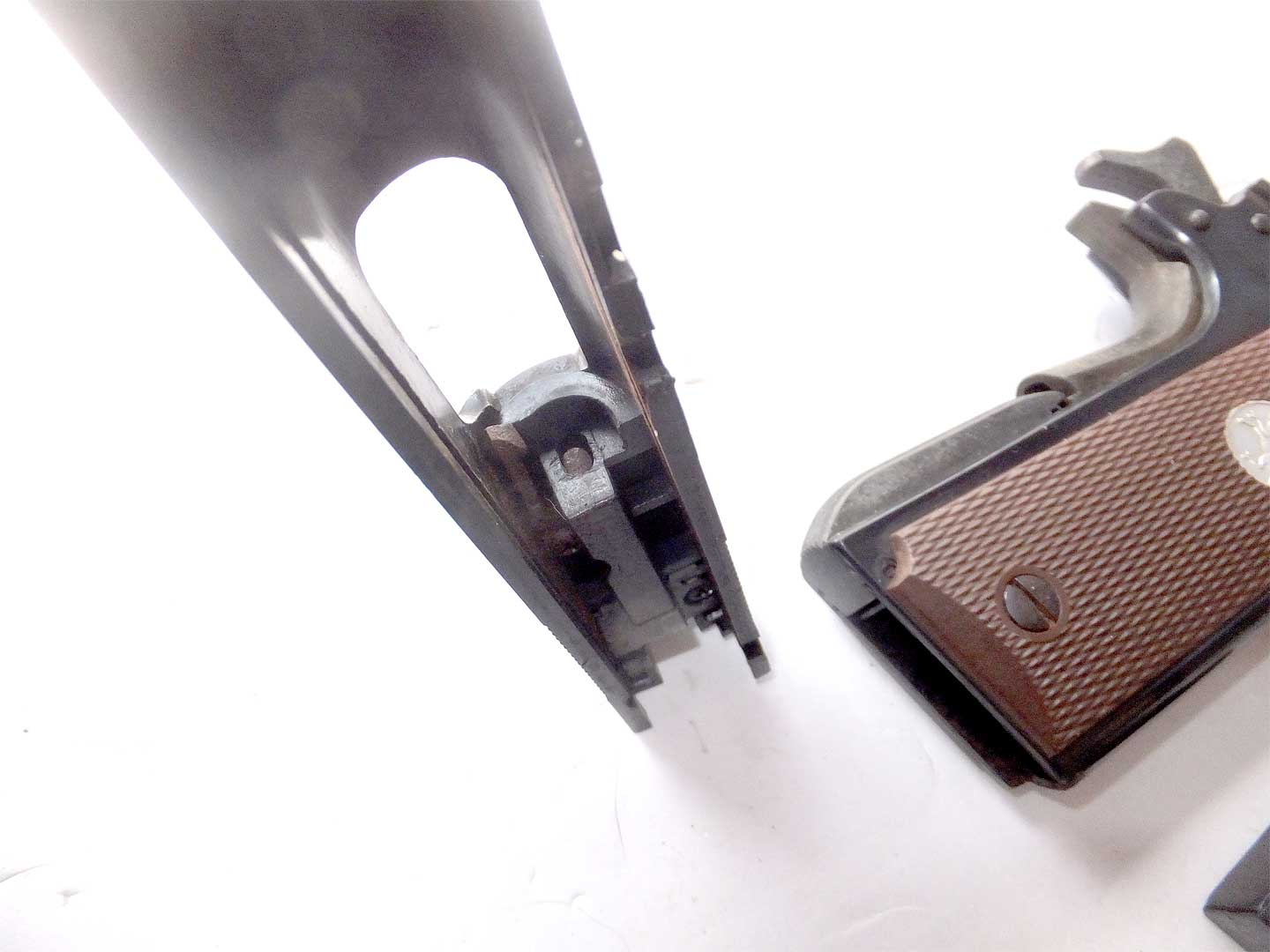 MGCと違ってブローバックタイプではありませんので、ハンマー右側にGM2の特徴である板状のディスコネクターは存在しません。