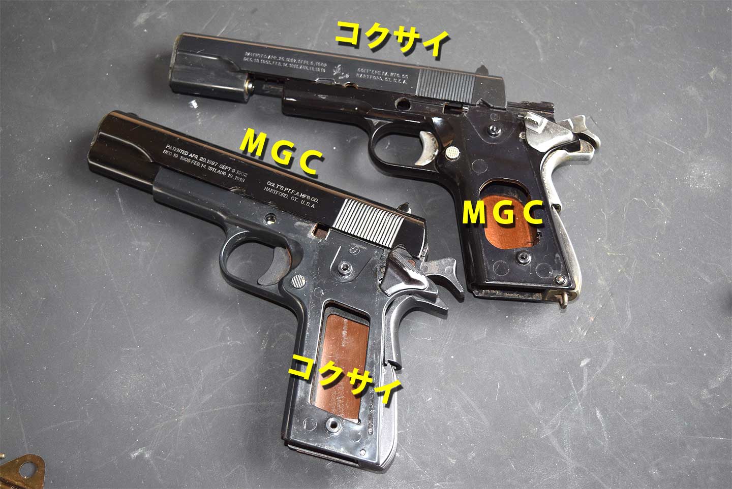 写真は上からリアルマッコイ、コクサイ、MGCですが、ご覧のようにリアルマッコイの木製グリップはぴったりと コクサイに合います。そうなのです、コクサイはメカ的には、GM2のデッドコピーなのですが、グリップネジ位置は コクサイ金属製と同じ位置にあり、そのため実物グリップも1mmくらい下がはみ出しますが装着可能なのです。 また、GM2と並べた写真で分かりますが、MGCよりもコクサイの方が少しフレームが大きいのです。