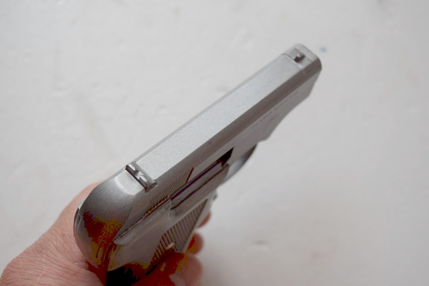 今回登場のモデルたちです。左下のガスガンは右写真のように発射不能になっています。デリンジャーはハドソンのプラスチックです。どうしてこんなに有名なモデルが、まともにモデルガンまたはエアガンになっていないのでしょう?映画タクシードライバーも 今の人は見ないのかな?いや、そんなことはないでしょう、現にタナカさんからトラビスモデルのM36 が出ていますもんね。 と、思っていたら、ゆも庵さんのブログにアクションさんが製造を計画しているとの記事が出ていました。 これは期待しちゃいます。