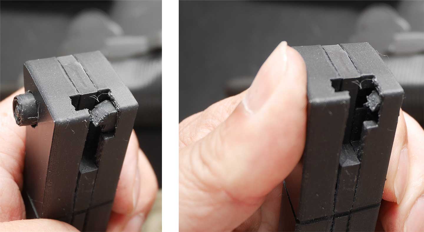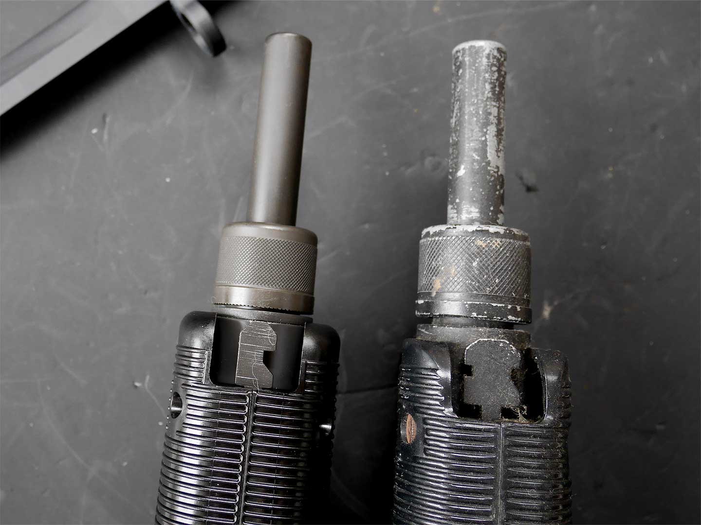 左がガスガンのウージー、右がマルシンのモデルガンです。マルシンのラグは幅が広くってこれに入る