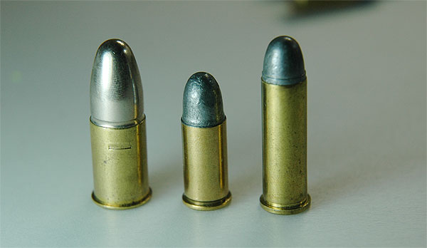 1922年に英国軍の拳銃は、兵士の負担軽量を考えたのか小口径に変更された。 それにしてもよくもこんなに口径をダウンさせた物だ。左が455ウェブリーである。 世界各地に植民地を抱えた英国は、現地住民との交戦を多く経験していたはずである。 これくらい大きな口径でないと人は一発で倒せない事を経験上知っていたのであろう。 この大きな弾を小さくした事は、戦場での拳銃の役割が小さくなっていった事を示している。 また、拳銃口径が変わった機会に永年にわたり独占的に軍に取り入っていて、いい加減やる気のなくなっていたウェブリー社を 退け、エンフィールド造兵廠の拳銃を採用した。 写真一番右は、1902年登場の38SWスペシャル。のちにリボルバーの世界標準弾となる。