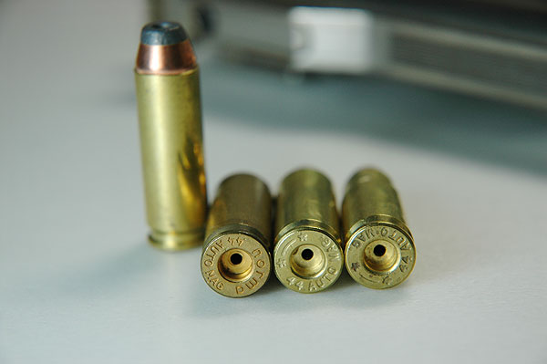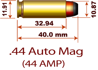 左がオートマグ弾で右がそれを絞った357オートマグ弾である。 357オートマグ弾は1973年に登場。市販カートは販売されず、 撃ちたい人は自分で作らなければならなかった。 ダイスは販売されている。 また、銃もバレルとスライドのアッセンブリーのみが販売され、フレームやマガジンは 44マグナムと共用である。他に41マグ用もあったらしい。