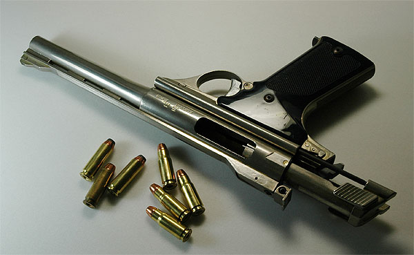 当時、拳銃弾最強であったレミントン44マグが回転式拳銃専用なのに対し