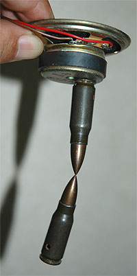 シエラの弾頭には鉛が詰まっているが7.92クルツには鉄が入っている。 すこし錆びているのが判ると思う。鉛は錆びる事はない。 貫通力を狙った物ではなく、鉛の資源を節約したのではないだろうか? ソビエトでは、そうだった。結果として貫通力が増す。 以上は想像である。 鉄なので下の写真のように磁石にくっつく。さすがに3個は無理であった。