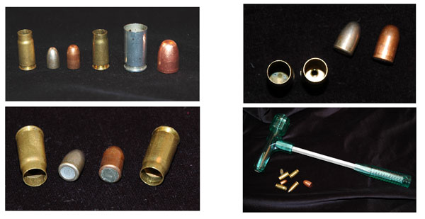 230グレインじゃないかな ? ケース内部はプライマー形式の違いが良く判る。 ボクサー型とベルダン型。当然一つ穴のボクサー型で無いとリロード出来ない。 南部弾の伝火孔はやけに小さい。 右下の写真は必殺「ブレット・プーラー」。ダミーカートで 遊ぶには必需品だ。弾頭を抜く事ができる。博多の鉄砲店で注文して取り寄せてもらった。7,000円くらいだった。 店主が20年ぶりに注文する品物だといっていた。ちなみに20年前は警察が買ったそうだ。 購入に当たり銃砲許可は関係ない。購入したらOリングが切れていたので輪ゴム二重巻きで使用している。 | ||||||||||||||||
