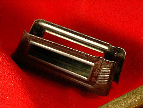 クリップは0.5mm のスチール製である。よく出来ている。 リムドケースなのでリムの部分が少し広くなるように、カート胴体部分のクリップ幅を 狭めている。 この写真の右側の膨らんでいるところから弾を入れる。