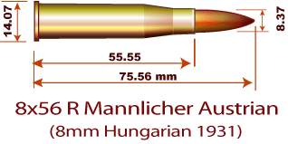 | ストレート引きボルトアクションのマンリカ1888 モデルに使用されていた8x50R 弾の後継弾の8x56R 弾。 少し長くなっている。8x56R は読んだ如しで8mm口径、ケース長が56mm、リムド形式である( ケース長は実際は55.5mm)。 |