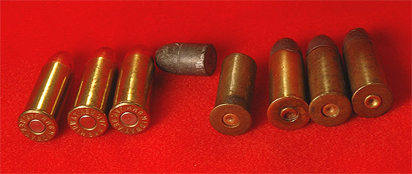右は、26年式拳銃オリジナル弾4発。左側は戦後のミッドウェイ社製造のレプリカ弾3発。