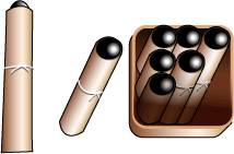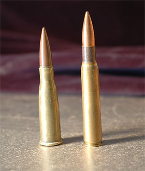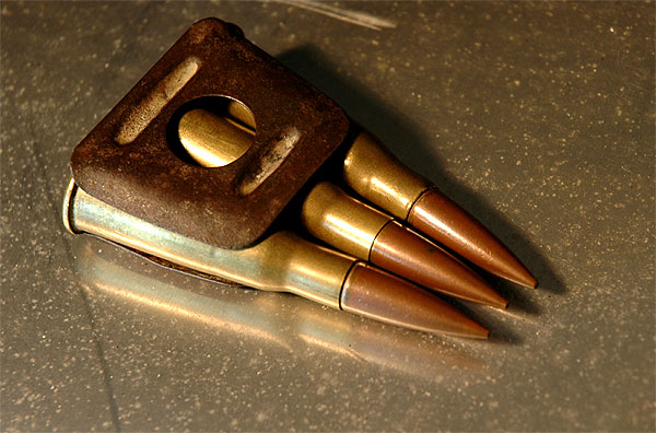 ![]() 8mmレベル弾は11mmのグラー弾に比べるとずいぶんとスリムになっているが、 それでも隣に置いた30-06弾と比較するとずいぶんとずんぐりむっくりである。 2弾絞りのケース形状からミルクビンと呼ばれた。
