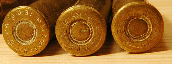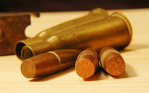 真ん中の数字の右側が製造年を表す。右の2つの弾は一時大戦の始まった1914年製で