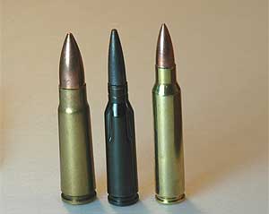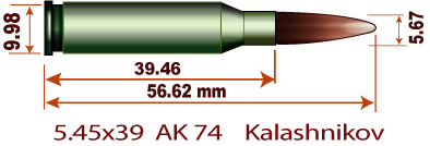 左からAK-47、AK-74、M-16 の弾米軍の5.56mm よりロシアの5.45mm 弾の方がケースが短く、弾頭が長いが弾頭重量は同じくらいだ。 エネルギーはM-16 の方が少し大きい。