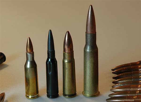 ひだりから5.6x39 、5.45x39 、7.62x39 、7.62x54R 。