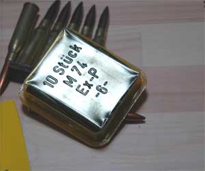 銃口のでっかいマズルブレーキが特徴だ。 西側諸国が5.56mm 弾(M-16の弾)をこぞって採用したためロシアでも検討され採用されたのであろう。 開発は銃とおなじく1974年と思われる。 現在、どれほど普及しているのか、また軍隊内部での位置づけなど私はよく知らない。 外観はAKM そのまま。カラシニコフ銃はストックに何も入っていないので 折りたたみ形式ストックなど、様々なバリエーションがある。