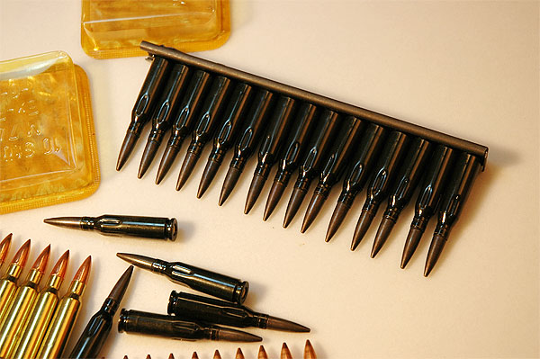 私が購入した物は、ボディにプレスで「すじ」の入れられた純正のダミーカートである。実銃の世界でも動作チェックなどにダミーカートが用いられるが、実弾と間違わないように ひと目で判るように「すじ」が入れてある。右写真にあるでっかい弾は、米軍の30-06 弾 のダミーカートである。 昭和 6年日本で26年式拳銃の模擬弾に実包が混入。死亡事故が起きたため、 ダミー弾はケース周囲にローレットを入れるように兵器局銃砲課から申請されている。 実包の存在する世界では、ダミー弾はひと目でそうと判らないと大変危険だ。