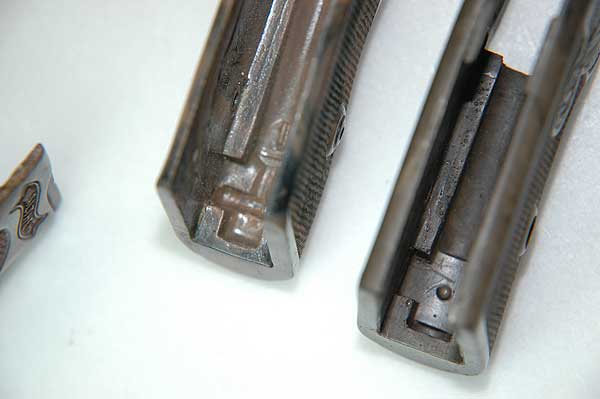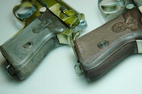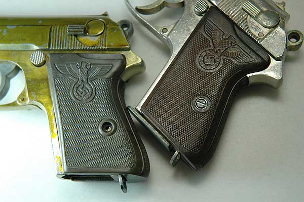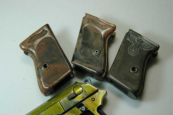 対して右の二つは、このように金属板は埋め込まれていない。 また、材質も柔軟性があるものでモデルガンに使用するにはレプリカ品のほうが良い。 はめ込みやすい。 1968年のロバート・ケネディ暗殺事件まではPPK もアメリカで普通に売られており、米国の会社で大量に戦前タイプのワンピースグリップが複製されたらしい。また、 面倒な事に レプリカグリップにも金属板が入っている物も存在する。購入の際には手にとって見るしか 真贋は付けがたいであろう。注意が必要だ。